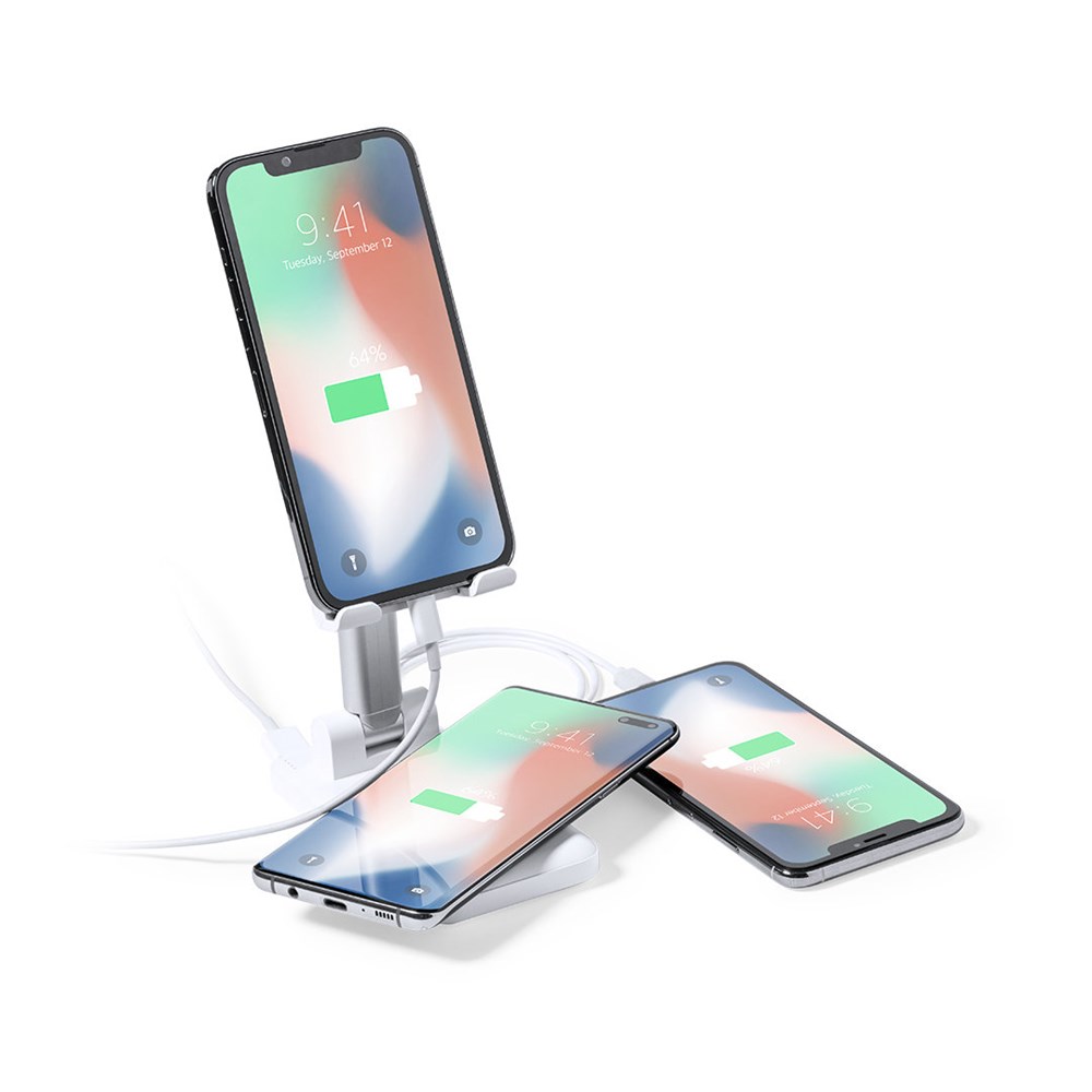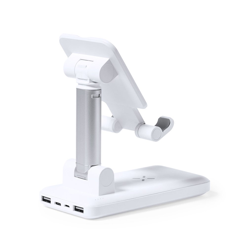 Alles-in-één opvouwbare multifunctionele houder, gemaakt van duurzaam wit ABS. Verstelbaar in hoogte en hoek voor een optimaal zicht op het scherm van de smartphone. Geïntegreerde 10W draadloze oplader en 5.000 mAh batterij, met Type-C ingang/uitgang, micro USB ingang en twee USB uitgangen. Compatibel met draadloos opladen van mobiele apparaten, inclusief Type-C oplaadkabel en gepresenteerd in een aantrekkelijke designdoos.De capaciteiten van al onze externe hulpbatterijen zijn reëel. Ze bevatten allemaal niet-gerecyclede batterijen van klasse A, met een levensduur van ten minste 500 laadcycli, en voldoen aan de CE-regelgeving. Bovendien zijn ze vervaardigd volgens RoHS-normen, en voldoen ze aan de volgende veiligheidseisen: Overlaadbeveiligingssysteem voor de powerbank. Volledig ontladingsbeveiligingssysteem, dat de duurzaamheid van de powerbank verhoogt. Blokkeersysteem om kortsluiting te voorkomen. Constant oplaadoverdrachtsysteem, in overeenstemming met de capaciteit van het doelapparaat.