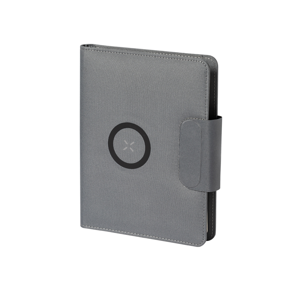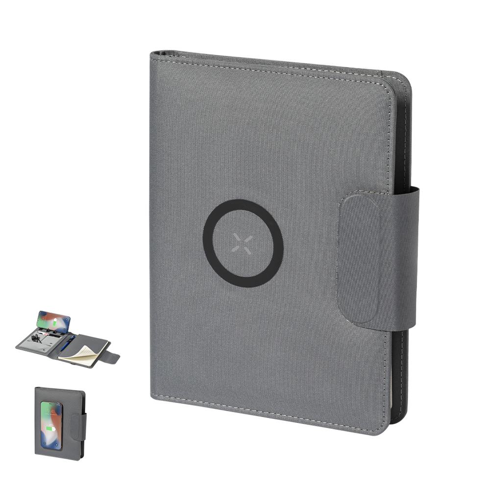 Multifunctionele map/notitieblok van 300D RPET polyester, gemaakt van gerecycled plastic, ter bevordering van het hergebruik van plastic afval en ter ondersteuning van de duurzaamheid van de planeet. Met magnetische sluiting en RPET-label aan de binnenkant. 10W draadloze oplader geïntegreerd in de hoes, met magnetische sluiting om het apparaat te gebruiken tijdens het opladen en inclusief plakring, compatibel met alle apparaten met Magsafe- en Qi-technologie.Geïntegreerde batterij met 5.000 mAh oplaadcapaciteit, met Type C in-/uitgangspoort en LED-oplaadstatusindicator, kabel inbegrepen.Binnenkant met smartphonehouder en diverse kaartvakken, inclusief penhouder en A5-notitieblok met 65 vellen met eenstreepindeling. Gepresenteerd in een aantrekkelijke designdoos.De capaciteiten van al onze externe hulpbatterijen zijn reëel. Ze bevatten allemaal niet-gerecyclede batterijen van klasse A, met een levensduur van ten minste 500 laadcycli, en voldoen aan de CE-regelgeving. Bovendien zijn ze vervaardigd volgens RoHS-normen, en voldoen ze aan de volgende veiligheidseisen: Overlaadbeveiligingssysteem voor de powerbank. Volledig ontladingsbeveiligingssysteem, dat de duurzaamheid van de powerbank verhoogt. Blokkeersysteem om kortsluiting te voorkomen. Constant oplaadoverdrachtsysteem, in overeenstemming met de capaciteit van het doelapparaat.