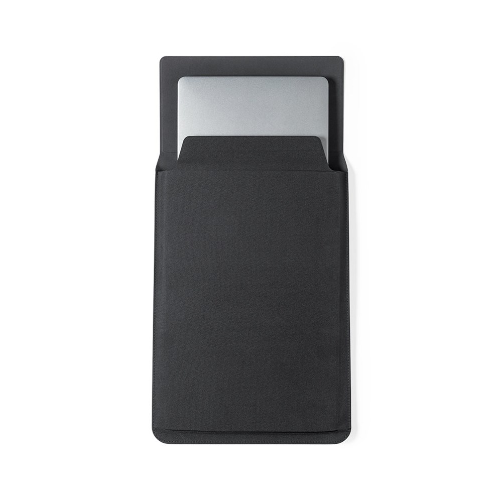 Computerkoffer van 600D RPET polyester, gemaakt van gerecycled plastic, dat het hergebruik van plastic afval stimuleert en bijdraagt aan de duurzaamheid van de planeet. Met magnetische sluiting en RPET-logo. Uitklapbare binnenkant met muismat en schuine computerhouder. Gepresenteerd in een aantrekkelijke individuele doos.
