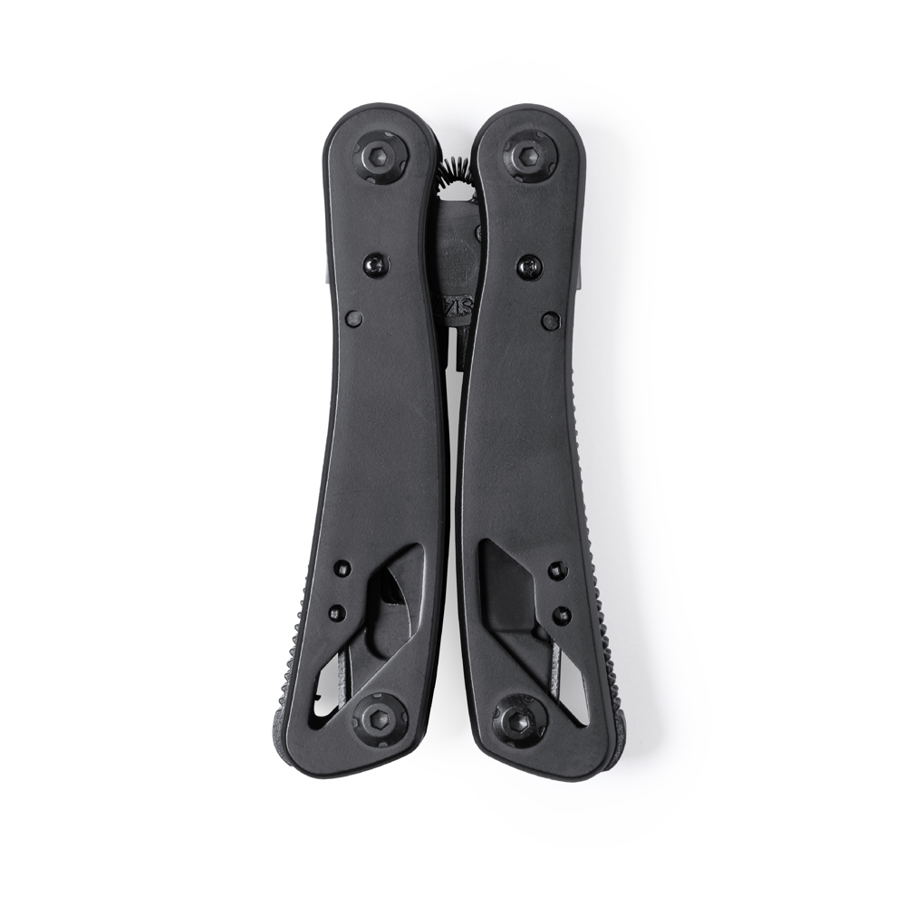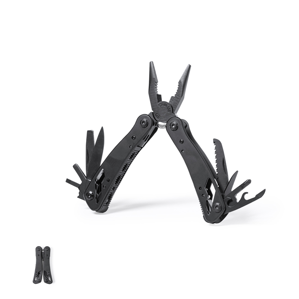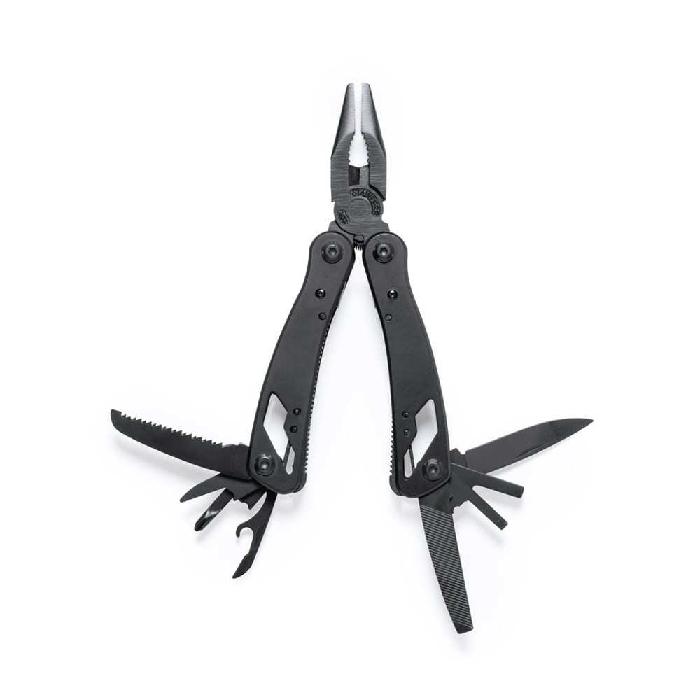 Multitool met accessoires in RVS met zwarte finish, en bijpassende resistente aluminium handgreep. Met 13 functies, waaronder mes, schroevendraaier, vijl, opener en tang. Opvouwbaar en compact van formaat, gepresenteerd in een individuele doos in zwart design.