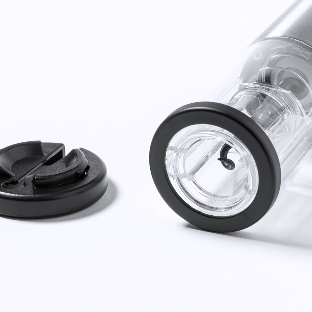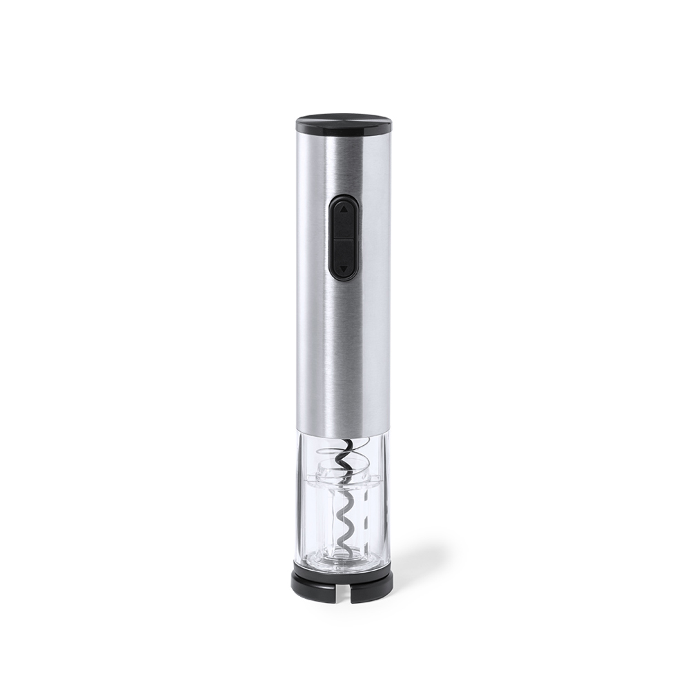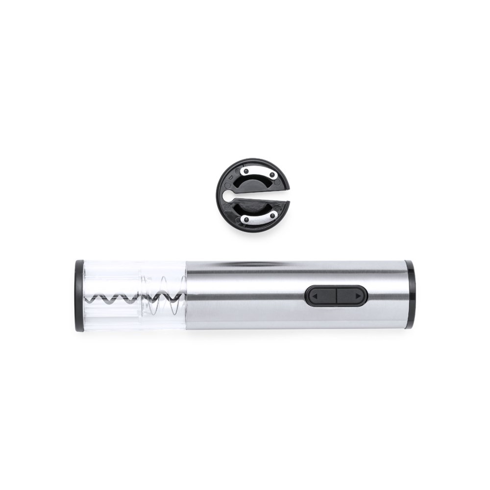 Elektrische kurkentrekker van roestvrij staal en resistent ABS, inclusief capsulesnijder. Gepresenteerd in een individuele doos, met handleiding in het Engels en Spaans. Werkt op batterijen (4xAA niet inbegrepen).