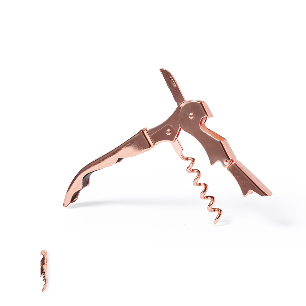 Kurkentrekker met dubbel hefboommechanisme gemaakt van roestvrij staal, gecoat in gegalvaniseerd koper. Met geïntegreerde capsulesnijder en gepresenteerd in een individuele doos met kraftdesign.