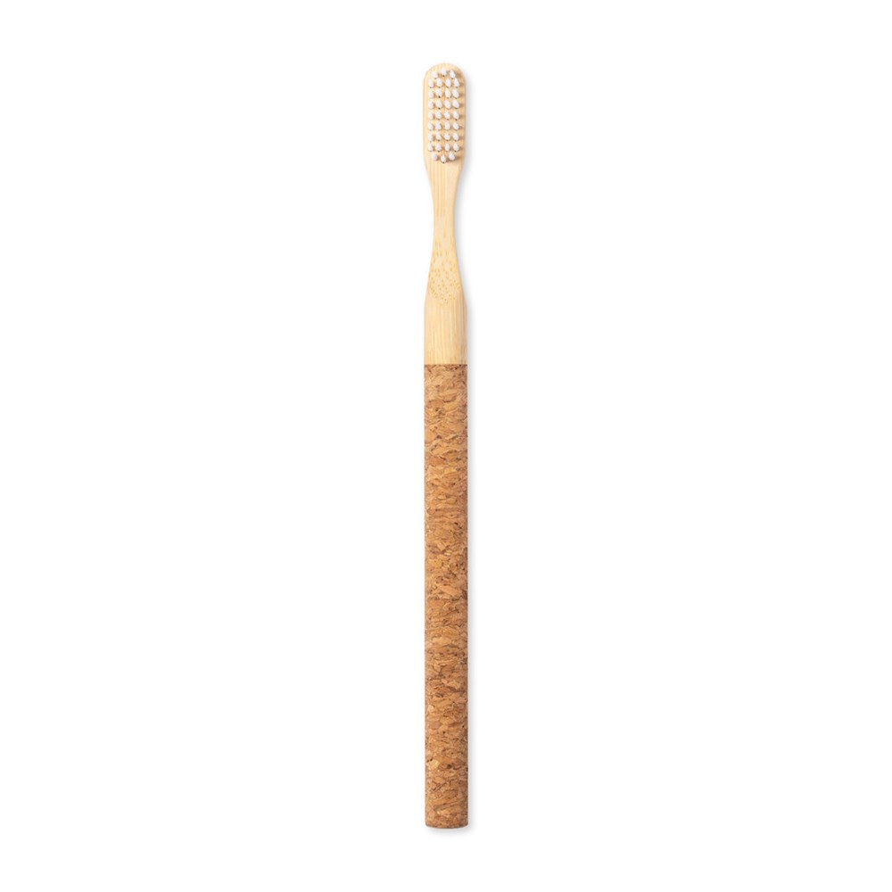 Tandenborstel uit de natuurlijn. Met handvat van natuurlijk kurk en body van bamboe, wat het gebruik van natuurlijke en duurzame grondstoffen bevordert.