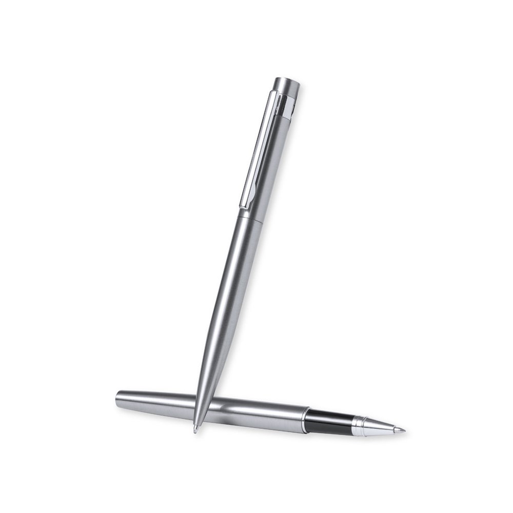 Milieuvriendelijke set van balpen en rollerpen, gemaakt van gerecycled roestvrij staal. Inclusief:Balpen met drukknopmechanisme, houder met zilveren afwerking en verchroomde fittingen. Metalen clip en met het kenmerkende gerecyclede roestvrij staal op de bovenkant van de pen. Jumbo cartridge en blauwe inkt.Rollerpen met drukknopmechanisme, met zilveren houder en verchroomde fittingen. Metalen clip en met het kenmerkende gerecyclede roestvrij staal op de kap. Jumbo cartridge en blauwe inkt.Set gepresenteerd in een individuele koffer in kraftpapier met bijpassende hoes.Staal is een van de meest gevraagde materialen en is bijna overal te vinden, van alledaagse producten tot grote constructies. Met talloze eigenschappen, waaronder duurzaamheid en een hoge mate van herbruikbaarheid, is het een gewaardeerd alternatief voor duurzame oplossingen. Op de juiste manier behandeld, kunnen nieuwe bronnen van oneindig gebruik worden verkregen.