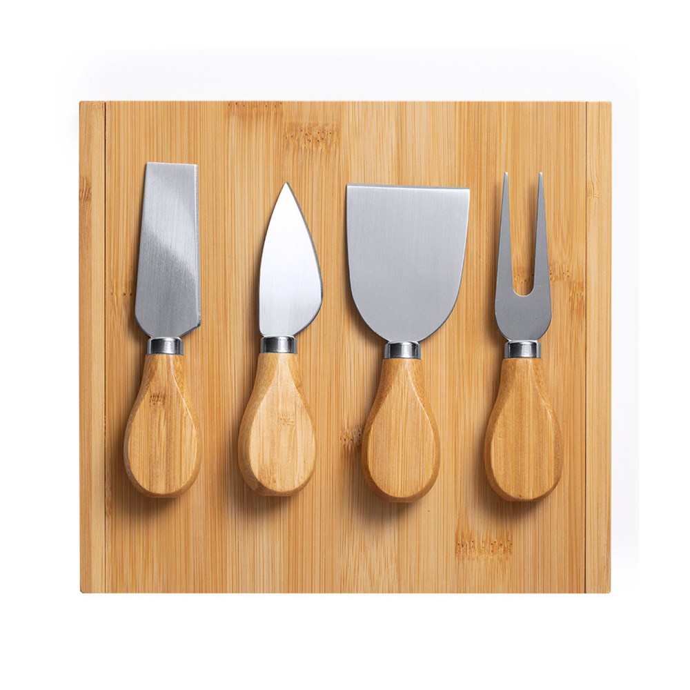 Origineel kaasstel in een vouwdoos met rechthoekige vorm. Gestanste binnenkant voor elk accessoire. Accessoires in roestvrij staal met bamboe handvat. Gepresenteerd in een individuele doos met kraftdesign.