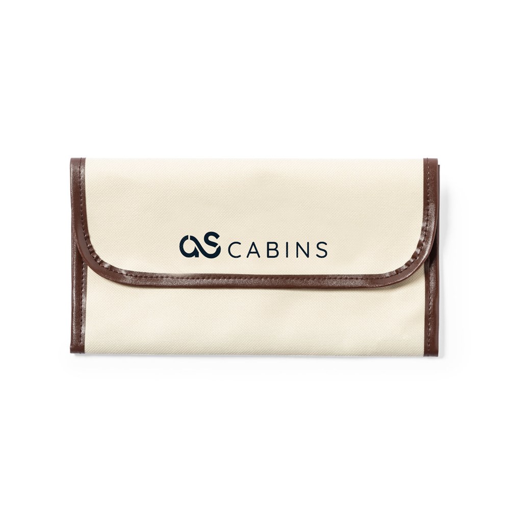 Reisdocumentenhouder van duurzaam 600D in naturel finish, met bruine PU lederen bies en verstevigingen. Flap met klittenbandsluiting en meerdere binnenvakken.