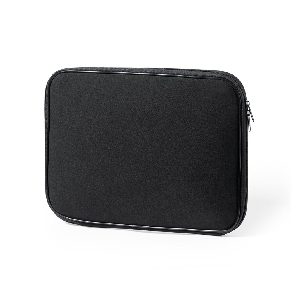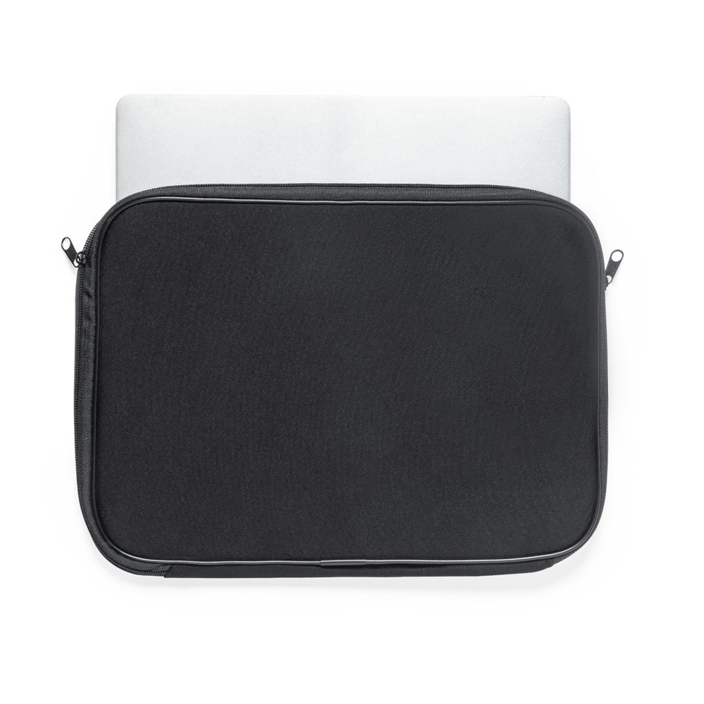 Laptophoes van duurzame softshell. In stijlvolle zwarte kleur, met vulling aan de binnenkant. Bijpassende ritssluiting met dubbele trekker. Voor laptops of tablets tot 13 inch.