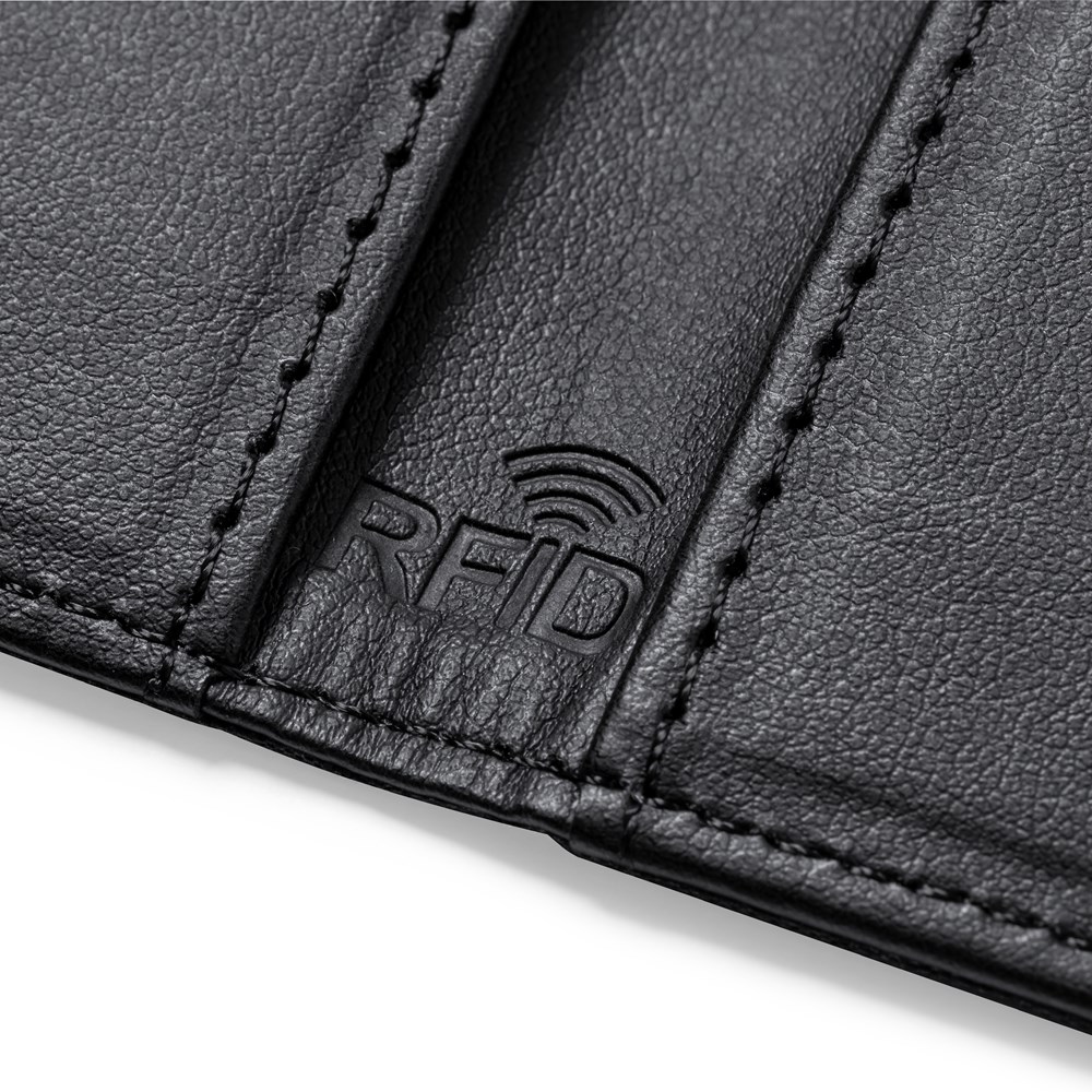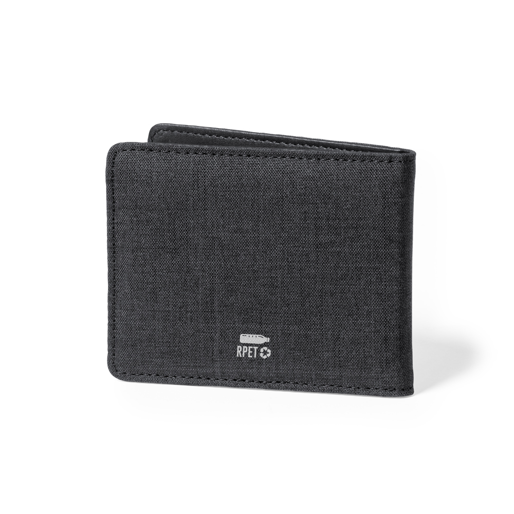 Elegante portemonnee en kaarthouder gemaakt van RPET polyester met zwarte finish. Binnenin met 6 onafhankelijke compartimenten voor pasjes en grote portemonnee. RFID (Radio Frequency Identification) beveiligingstechnologie die kaartgegevens veilig houdt. Met het onderscheidende van RPET buitenkant en de RIFD binnenkant.RPET-materiaal is gemaakt van gerecycled plastic, om het hergebruik van plastic afval te stimuleren en de duurzaamheid van de planeet te helpen.