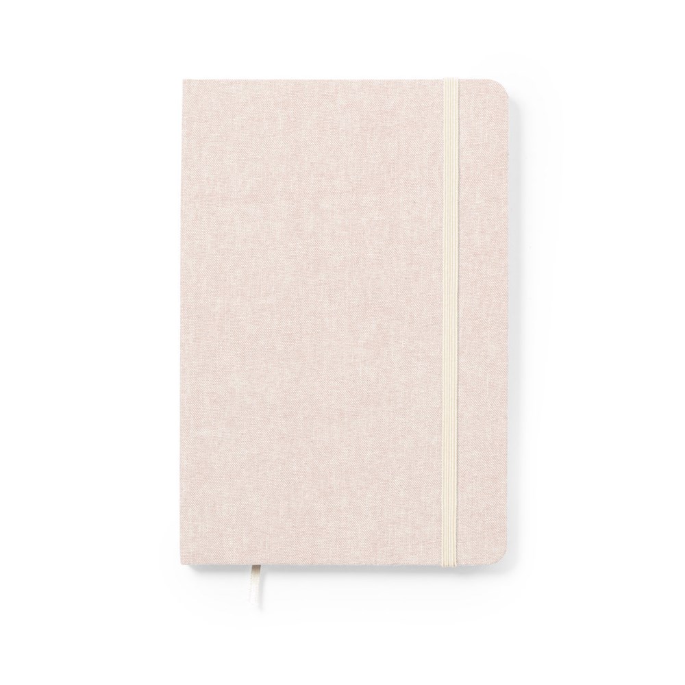 Notitieblok ¨natuur lijn¨van gerecyled kantoen. Met harde kaft en elastische band in contrastkleur. Binnenkant met 100 effen vellen en stoffen boekenlegger. Verkrijgbaar in een groot aantal kleuren, met logo van gerecycled kantoen op de achterkant.GRS-certificering (Global Recycled Standard) beschikbaar, die de gerecycleerde oorsprong garandeert van het materiaal dat is gebruikt om het product te vervaadigen.
