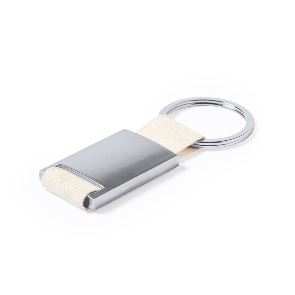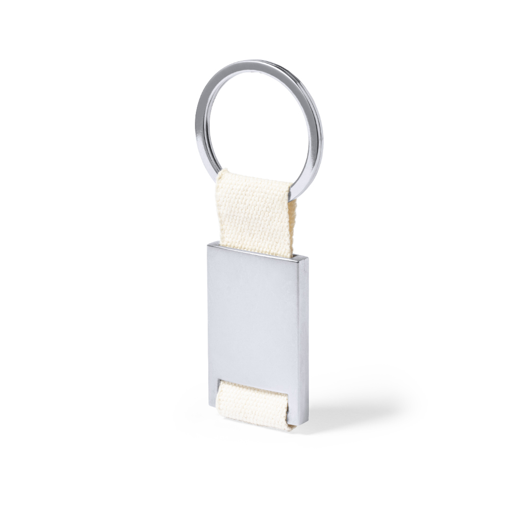 Sleutelhanger met zilverkleurige metalen behuizing. Lint van katoen met natuurlijke afwerking, met breed merkoppervlak en bijpassende metalen ring. Gepresenteerd in een individuele zak met kraftkartonnen inzetstuk.
