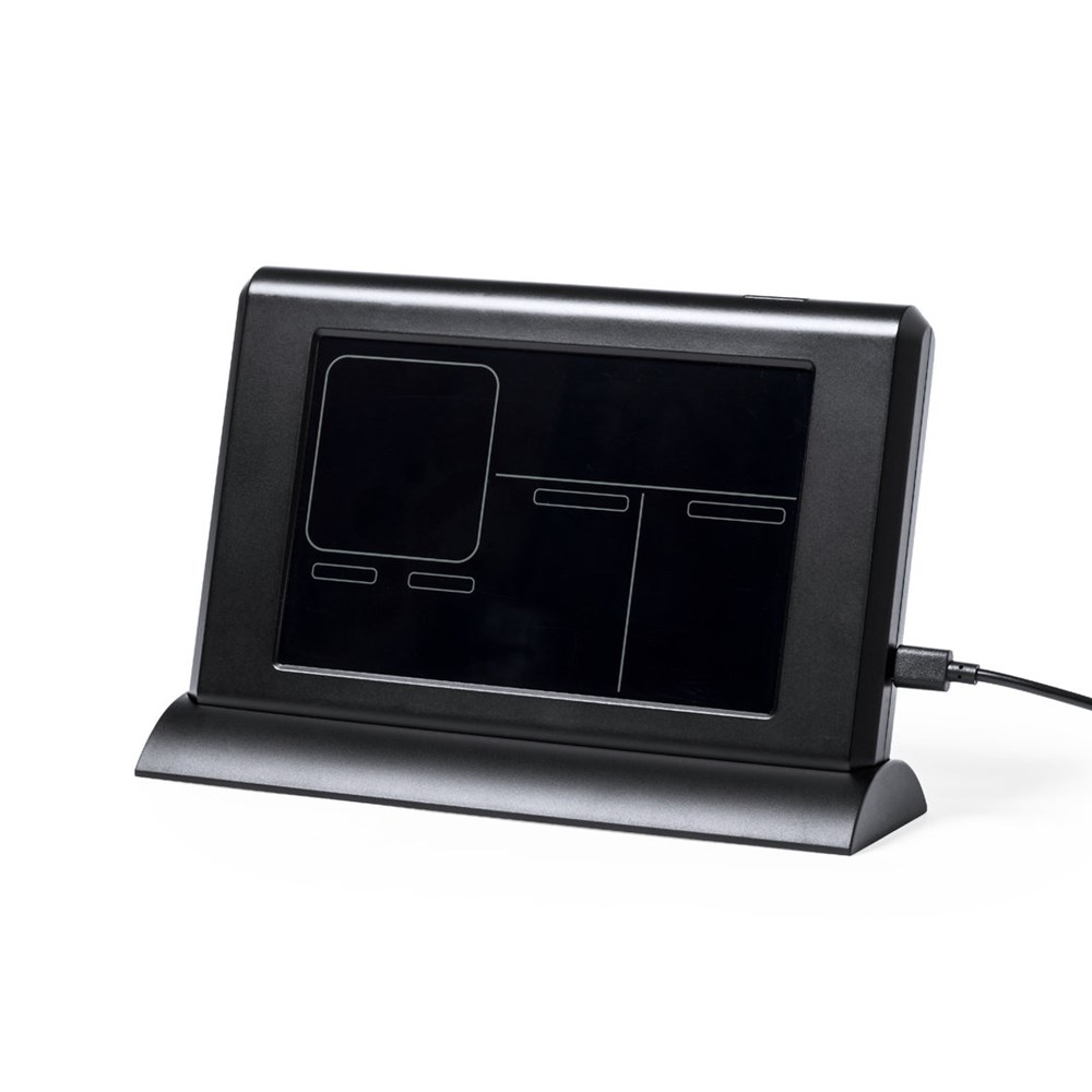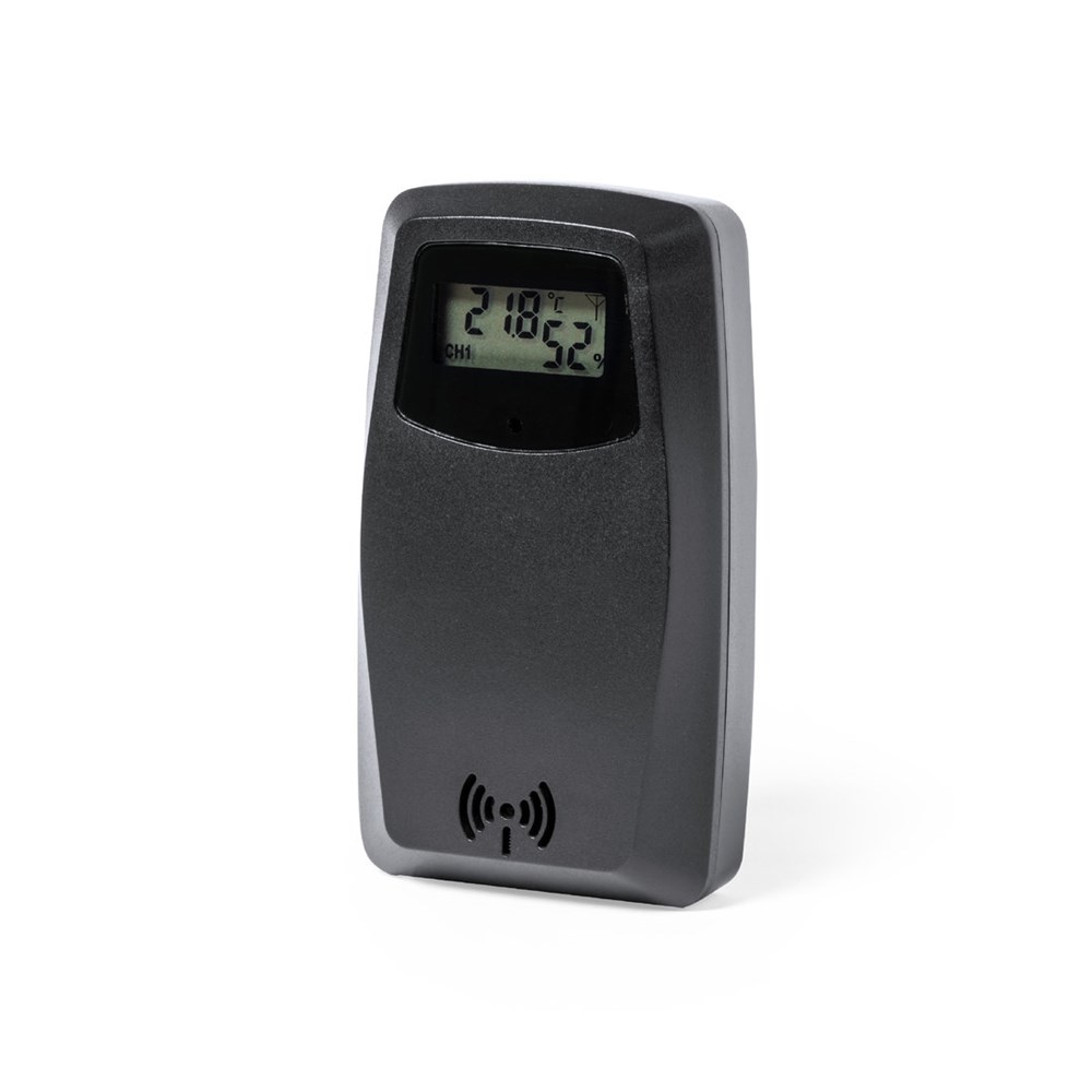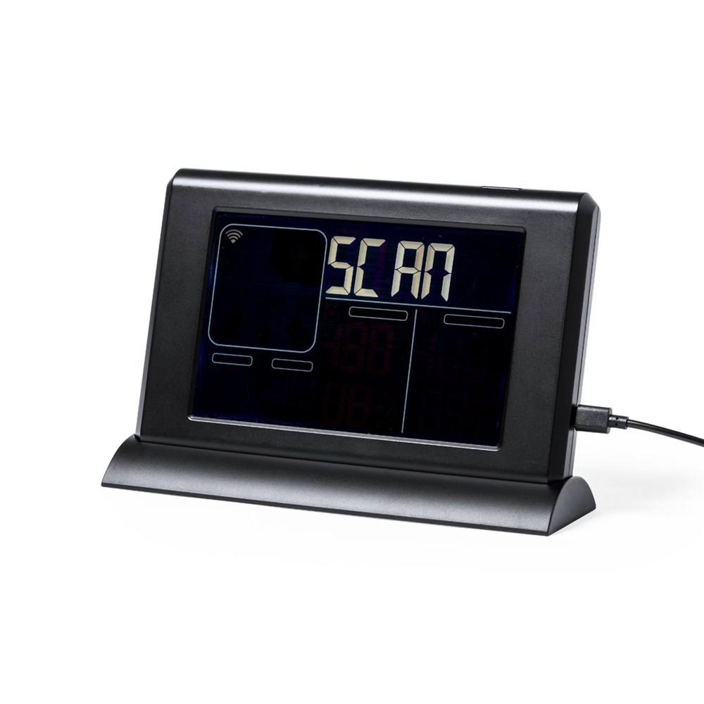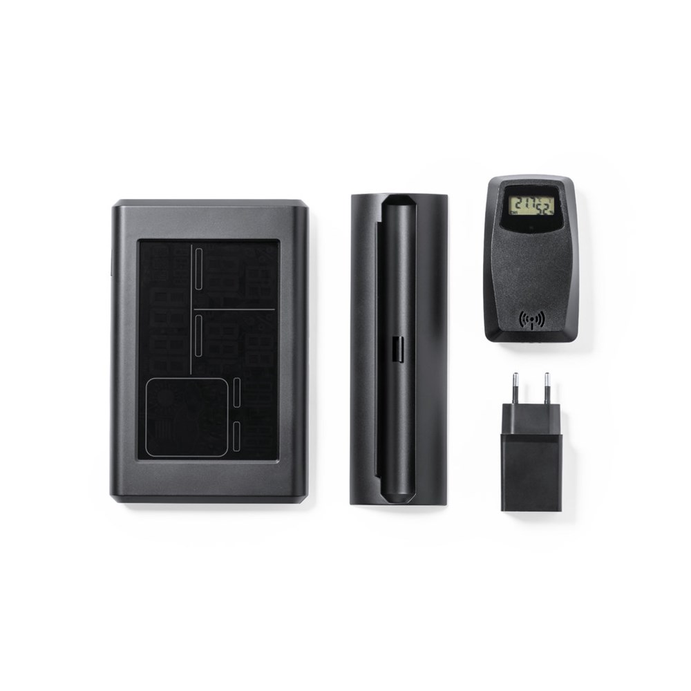 Hoogwaardig, multifunctioneel weerstation, gemaakt van duurzaam ABS met een satijnzwarte afwerking. Inclusief verlicht, gemakkelijk af te lezen display met kleurengrafiek. Met draadloze buitentemperatuur/vochtigheidssensor en geïntegreerde binnentemperatuur/vochtigheidssensor. Alarm- en kalenderfuncties, met APP beschikbaar - compatibel met iOS en Android - voor afstandsbediening via WiFi-netwerk die extra functionaliteiten toevoegt. Voedingsadapter en 1 m lange USB-kabel inbegrepen, met wandmontagebeugel. Externe sensor met batterijvoeding (2xAAA niet inbegrepen). Gepresenteerd in een individuele Kraft ontwerp doos, met handleiding in het Engels en Spaans.