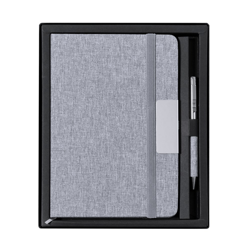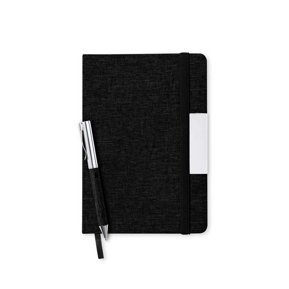 Set van notitieblok en balpen in RPET, gemaakt van gerecycled plastic om hergebruik van plastic afval te stimuleren en de planeet te verduurzamen. Inclusief:Notitieblok met harde kaft, met metalen inzetstuk op de voorkant, stoffen bladwijzer en bijpassende elastische band. 100 vel binnenin met gestreepte lay-out en RPET-kenmerk op de achteromslag.Verchroomde metalen balpen met RPET polyester gecoate houder. Elegante metalen clip en bijpassende accessoires, draaimechanisme en blauwe inkt. Met RPET onderscheidend op loop.Set gepresenteerd in een elegante zwarte designkoffer, met apart vak voor notitieblok en balpen.