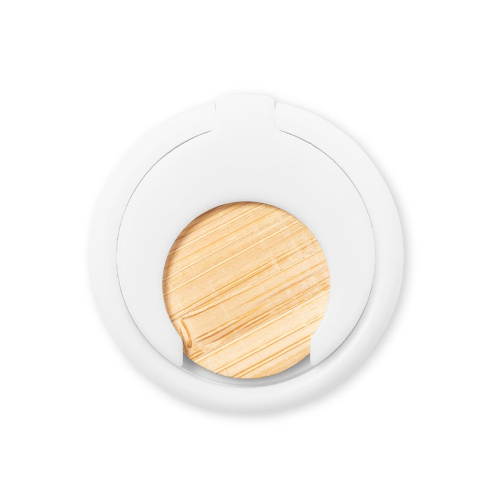 Multifunctionele smartphonehouder met geïntegreerd muntje voor winkelwagentje en uitklapbare ring/houder. Behuizing gemaakt van duurzaam ABS in witte afwerking, met bamboe munt. Met plakband, extra sterke fixatie en zonder resten bij het losmaken van het apparaat.