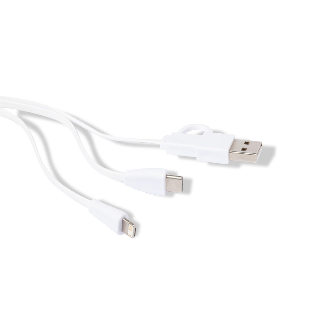 Oplaadkabel met sleutelhanger, uitgevoerd in bamboe met marmeren extractinzet. Inclusief USB en Type-C ingangsaansluitingen, met Lightning, Micro USB en Type-C 5VDC 2,4A uitgangen. Gepresenteerd in een individueel kraft ontwerp zakje.