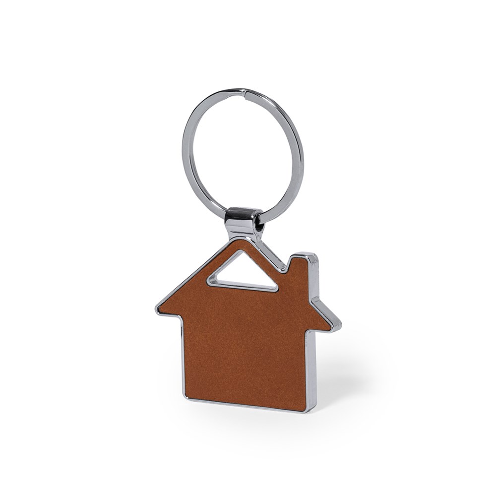 Sleutelhanger gemaakt van gerecycled leer. In bruin, met aan één kant een logo van gerecycled leer. Vlakke andere kant voor branding, met verchroomde metalen ring. Verkrijgbaar in vier designs:A: huisB: AutoC: CirkelD: RechthoekGepresenteerd in een individuele zak van gerecycled kraftpapier.Gerecycled leer redt de vezels die tijdens het leerproductieproces worden weggegooid, minimaliseert materiaalverspilling en helpt de impact op het milieu te verminderen terwijl de oorspronkelijke eigenschappen behouden blijven.