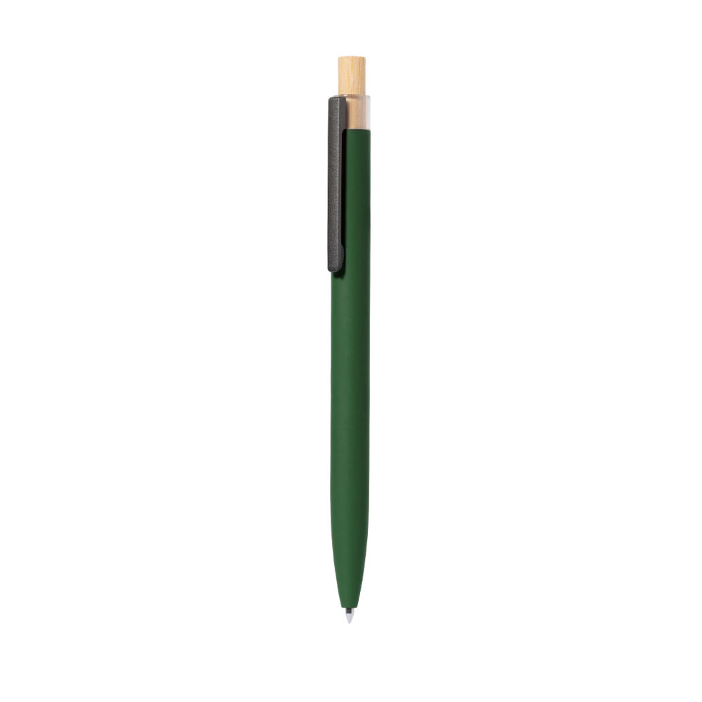 Balpen met drukknopmechanisme gemaakt van gerecycled aluminium. Bamboe drukknop en rubberen grip,...meer
