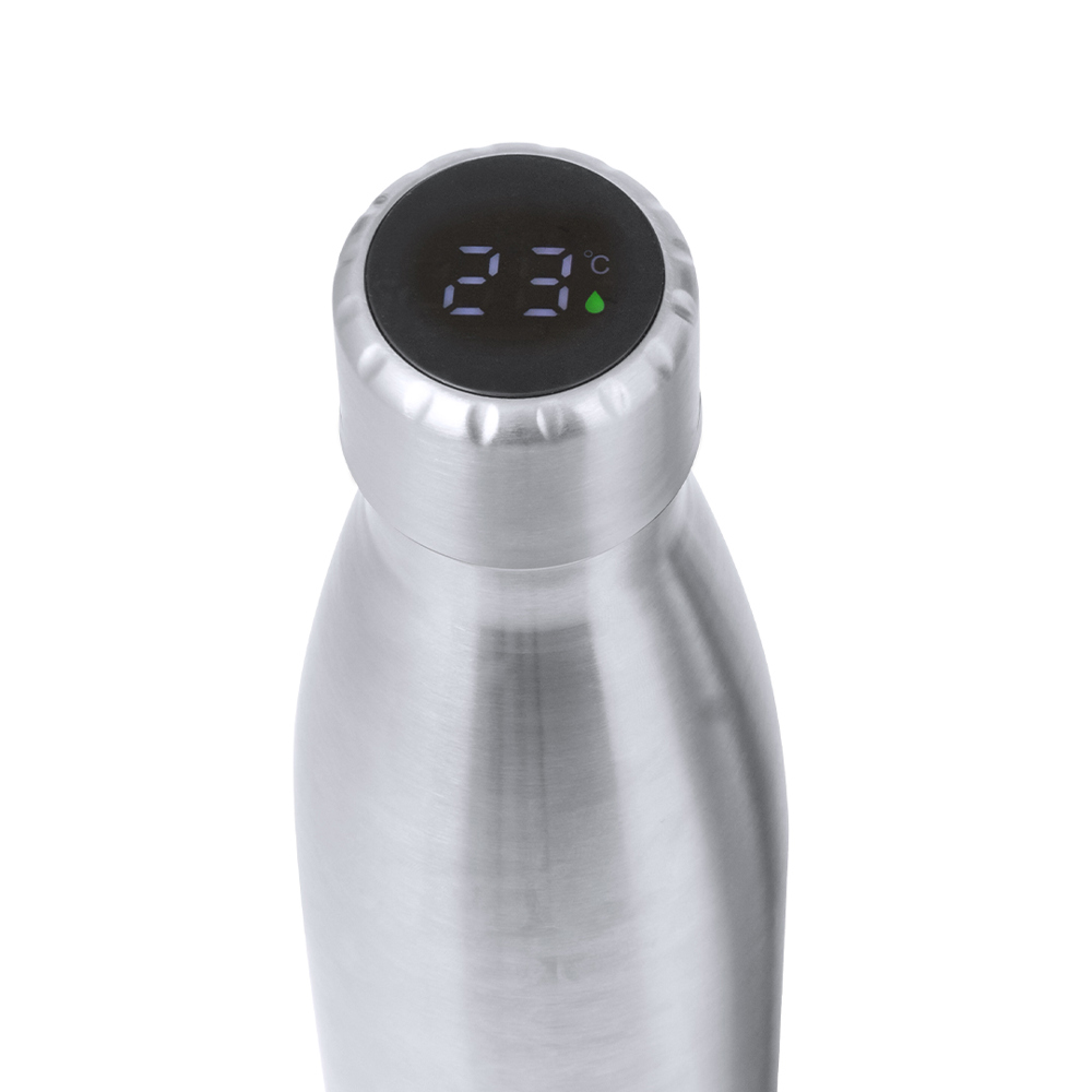 Dubbelwandige roestvrijstalen thermosfles met een inhoud van 500 ml en matte afwerking. Met voelbare temperatuurindicator in de dop en oplaadbare batterij - inclusief zwarte kabel type C. BPA-vrije veiligheidsdop en gepresenteerd in een aantrekkelijke individuele kraft design doos in een gerecyclede zak. Werkt op batterijen (knoopcel inbegrepen), met gebruiksaanwijzing in het Engels en Spaans..