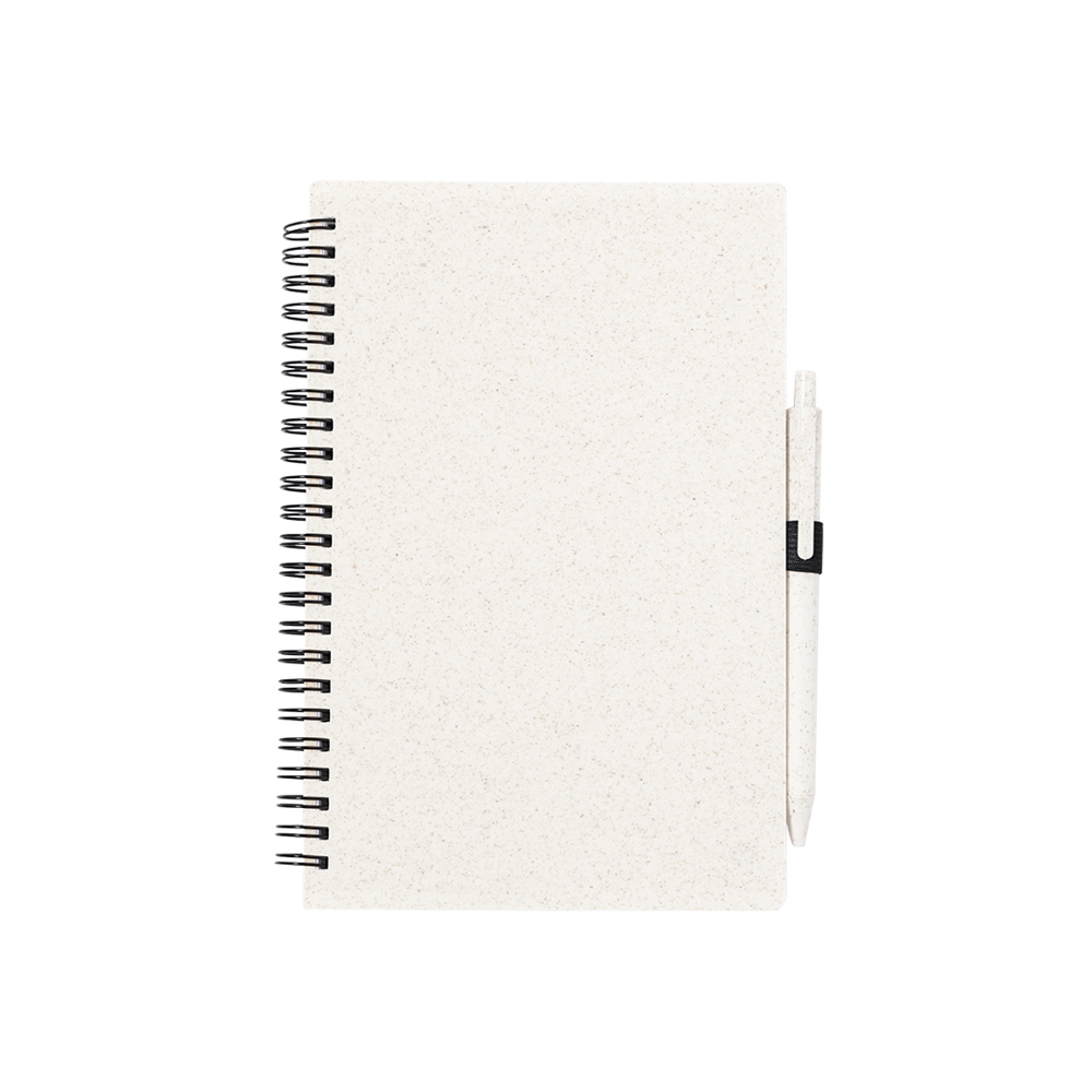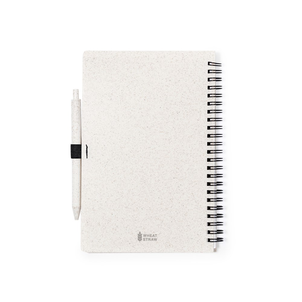 Set van notitieboek en pen. Ring notitieboek met kaft van tarwestro en penhouder. 80 vellen met ecodesign en indeling met één streep. Balpen met drukknopmechanisme, tarwestro en blauwe inkt. Met tarwestrologo. Gepresenteerd in een individueel gerecycled zakje.Gemaakt met plantaardige elementen om het gebruik van natuurlijke grondstoffen te stimuleren en de uitstoot van vervuilende stoffen te verminderen.