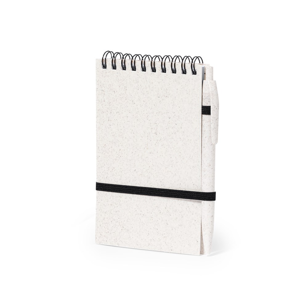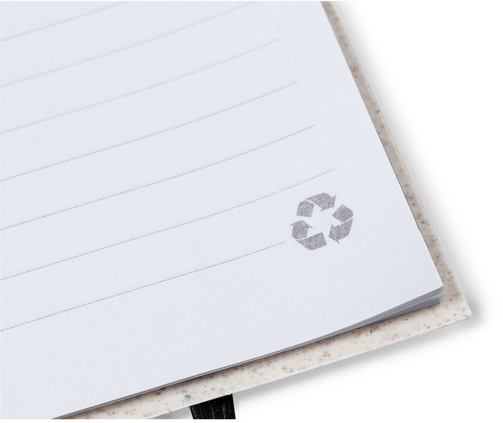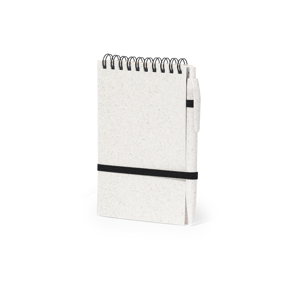 Set ringnotitieboekjes met kaft van tarwestro en bijpassende balpen, ook van tarwestro. Compact formaat, met elastische sluiting in elegant zwart. Inclusief 70 vellen met enkelgestreepte lay-out en ecodesign. Balpen met drukknopmechanisme in blauwe inkt, met Wheat Straw-logo. Gepresenteerd in een individueel gerecycled zakje.Gemaakt met plantaardige elementen om het gebruik van natuurlijke grondstoffen te stimuleren en de uitstoot van vervuilende stoffen te verminderen.