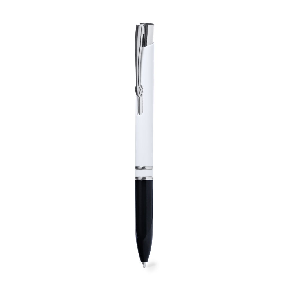 Elegante balpen met drukknopmechanisme. Met body afgewerkt in glanzend wit en grip in een groot aantal kleuren. Gemaakt van duurzaam ABS met glanzende afwerking. Jumbo inktpatroon en blauwe inkt.