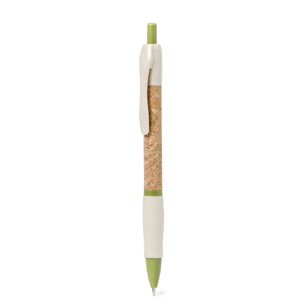 Balpen met drukknopmechanisme en natuurlijke kurken houder. Clip, punt en drukknop in tarwe riet. Verkrijgbaar in een groot aantal kleuren. Tarwestrologo op de bovenkant van de pen. In blauwe inkt.Gemaakt met plantaardige elementen om het gebruik van natuurlijke grondstoffen te bevorderen en de uitstoot van vervuilende stoffen te verminderen.