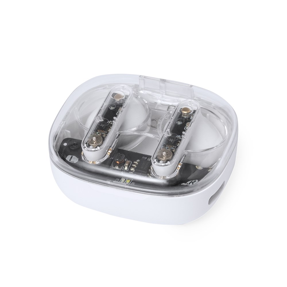 Oortelefoon in opvallend transparant design. Bluetooth® 5.3-verbinding en lange batterijduur. Ergonomisch ontworpen, met geïntegreerde aanraakbedieningsknop op de headset, bijpassende oplaadbasis en oplaadstatusindicatoren. Handsfree functie. Oplaadpoort met Type-C-ingang (kabel meegeleverd). Gepresenteerd in individuele kraft designdoos en gerecyclede zak.