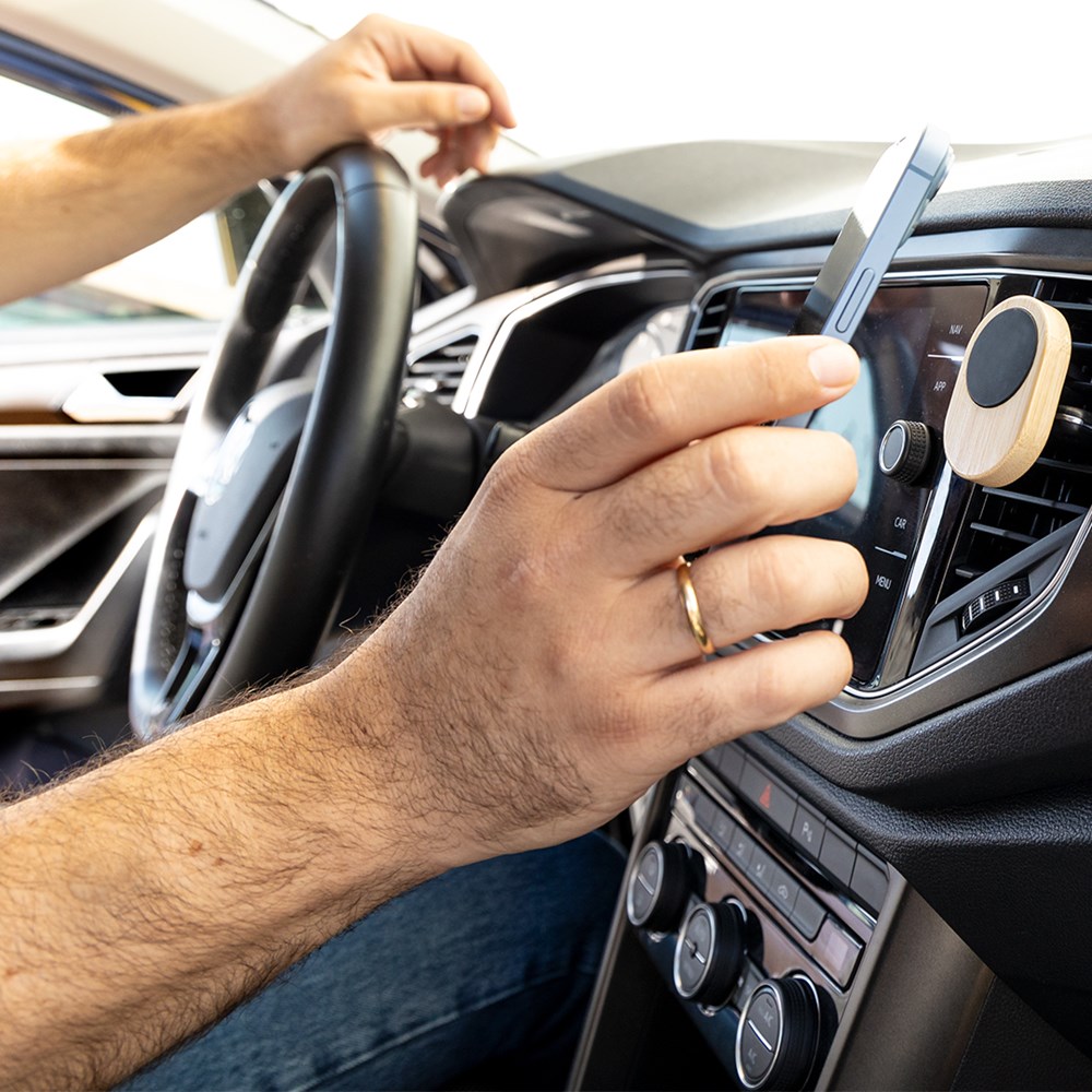 Autogrillhouder voor smartphone van bamboe. Comfortabele en veilige magnetische bevestiging....meer