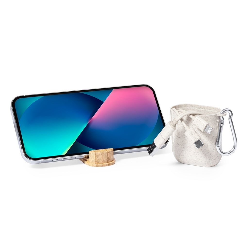 Oplaadkabel van tarwestro. Met Type-C- en USB-ingangen en Type-C-, Lightning- en Micro USB-uitgangen. 5V gelijkstroom 2,4A.Gepresenteerd in een elegante designkoffer van tarwestro en bamboe sluitdeksel, met houderfunctie voor smartphones.Gemaakt met plantaardige elementen om het gebruik van natuurlijke grondstoffen te bevorderen en de uitstoot van vervuilende stoffen te verminderen.