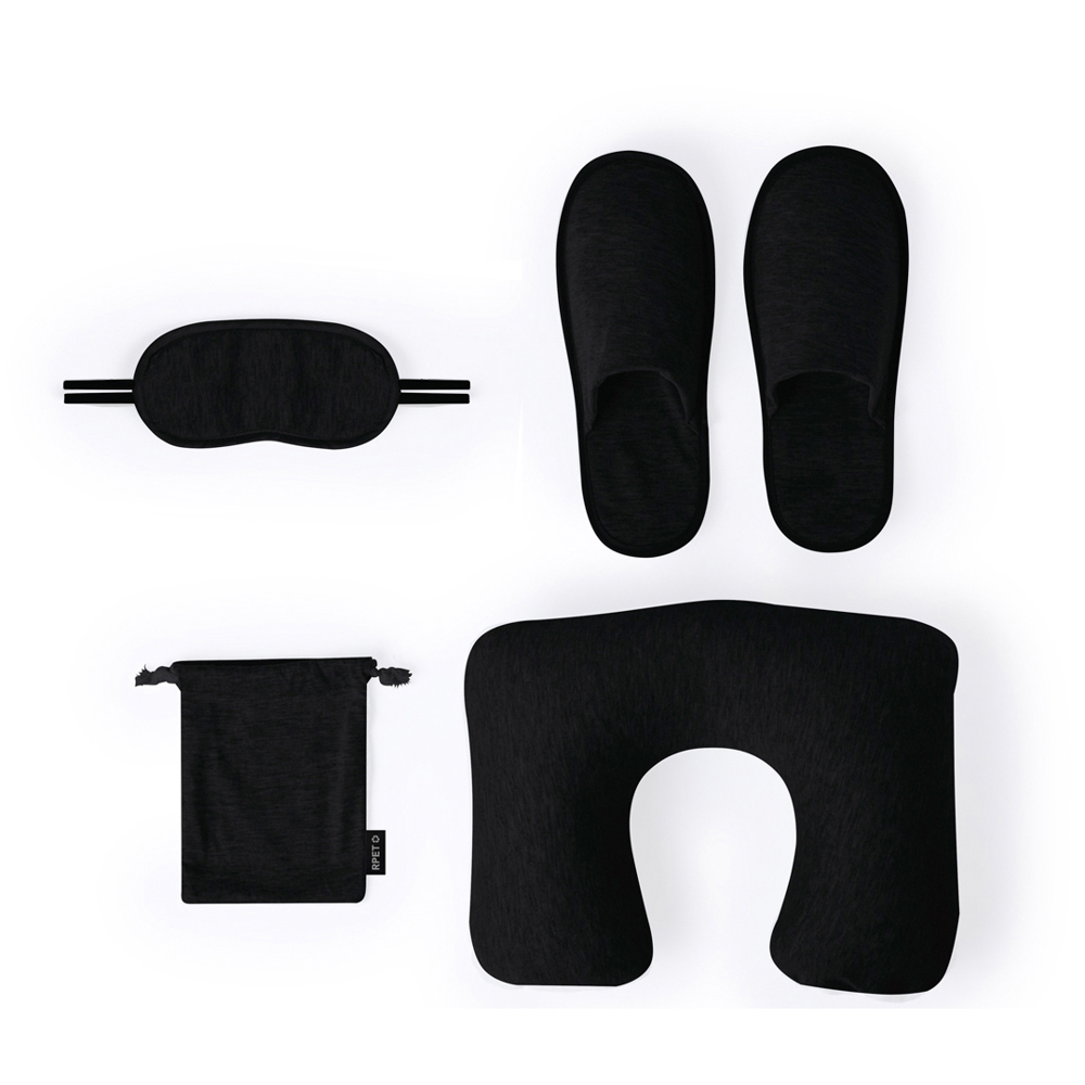 Geweldige reisset van zacht polyester. Inclusief: Ergonomisch nekkussen. Zacht masker met verstelbare riem. Bijpassend paar pantoffels. Gemakkelijk op te bergen in een RPET-zakje en verkrijgbaar in stijlvolle kleuren, met RPET-logo op het zakje. RPET-materiaal is gemaakt van gerecycled plastic, waardoor het hergebruik van plastic afval wordt bevorderd en de duurzaamheid van de planeet wordt bevorderd.