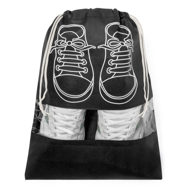 Schoenentas gemaakt van non-woven. Praktisch voor het opbergen van schoeisel en bedrukt met een klassiek schoenontwerp. Inclusief een praktisch transparant venster om de inhoud te bekijken, en een trekkoordsluiting. Verkrijgbaar in verschillende kleuren en met witte details.