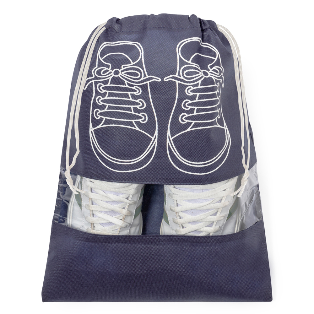 Schoenentas gemaakt van non-woven. Praktisch voor het opbergen van schoeisel en bedrukt met een klassiek schoenontwerp. Inclusief een praktisch transparant venster om de inhoud te bekijken, en een trekkoordsluiting. Verkrijgbaar in verschillende kleuren en met witte details.