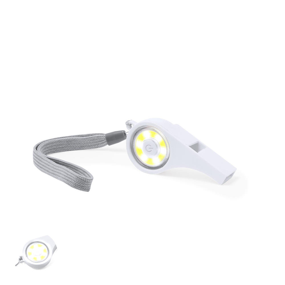 Multifunctioneel fluitje met geïntegreerd licht in het lichaam. Gemaakt van robuust ABS, met 6 COB-lampen en verschillende verlichtingsposities: stabiel met twee intensiteitsniveaus; en knipperend voor een betere zichtbaarheid. Draagkoord voor gemakkelijk dragen en aangedreven door een knoopcelbatterij (meegeleverd). Gepresenteerd in een kraft-designdoos.