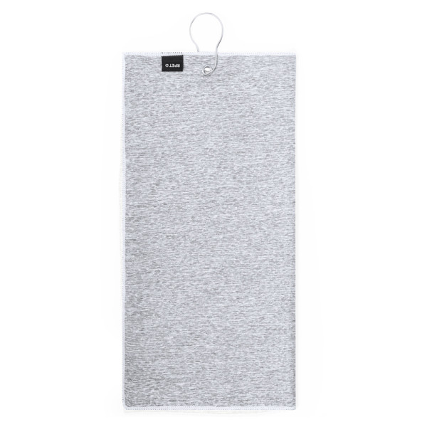 Golfhanddoek van RPET, absorberend en zacht met afmetingen van 40x60 cm. In het midden zit een versterkte ring en een karabijnhaak, beide van roestvrij staal. Met RPET-label.RPET-materiaal is gemaakt van gerecycled plastic, waardoor het hergebruik van plastic afval wordt bevorderd en de duurzaamheid van de planeet wordt geholpen.