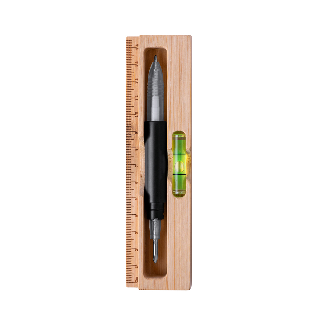 Praktische multitool met 5 functies, gemaakt van resistent koolstofstaal en afgewerkt in zwart. Met schroevendraaierfuncties (plat en kruispunt) en balpen met blauwe inkt (jumbo-cartridge). Gepresenteerd in een duurzame bamboe koffer, met geïntegreerde waterpas en liniaal. Individueel verpakt in een kraft-designdoos.