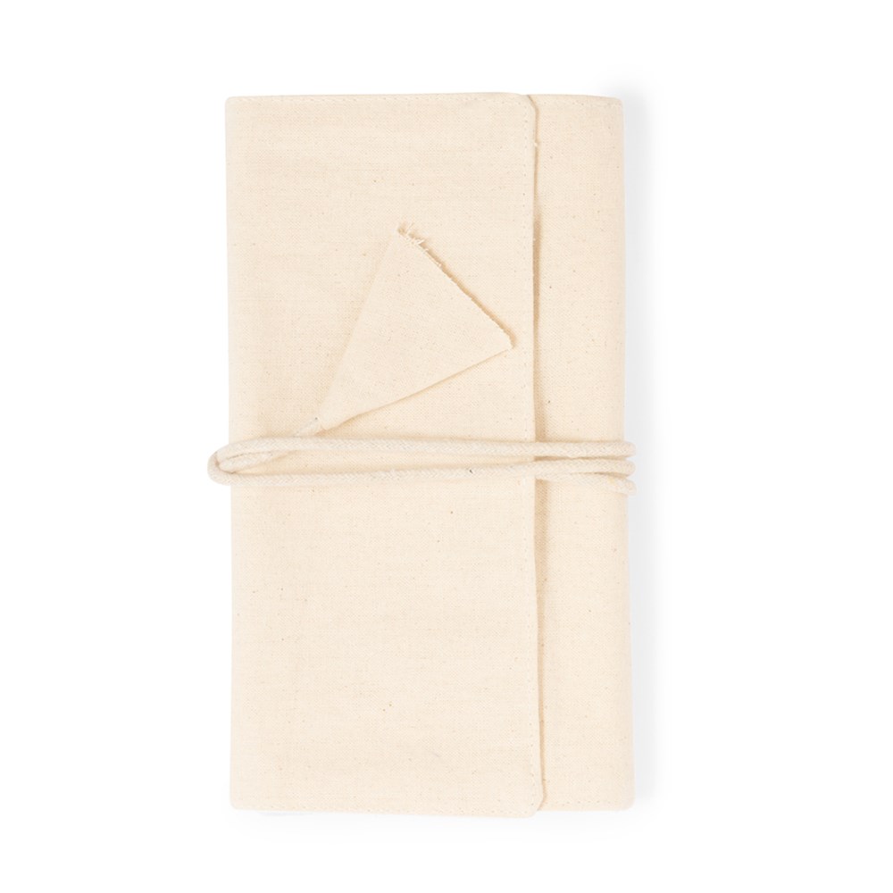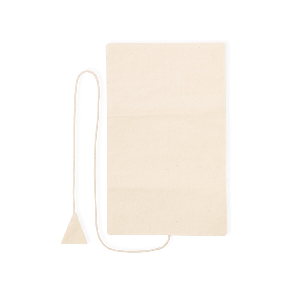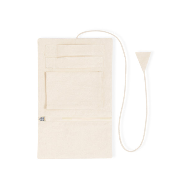 Opvouwbaar juwelendoosje van katoen, voor het opbergen van dierbare persoonlijke spullen. In natuurlijke kleur, met 3 verschillende delen: bovenste deel met linten, middelste deel met zakje en onderste deel met rits. Het kan worden opgevouwen en stevig worden vastgehouden met het bijpassende koord.