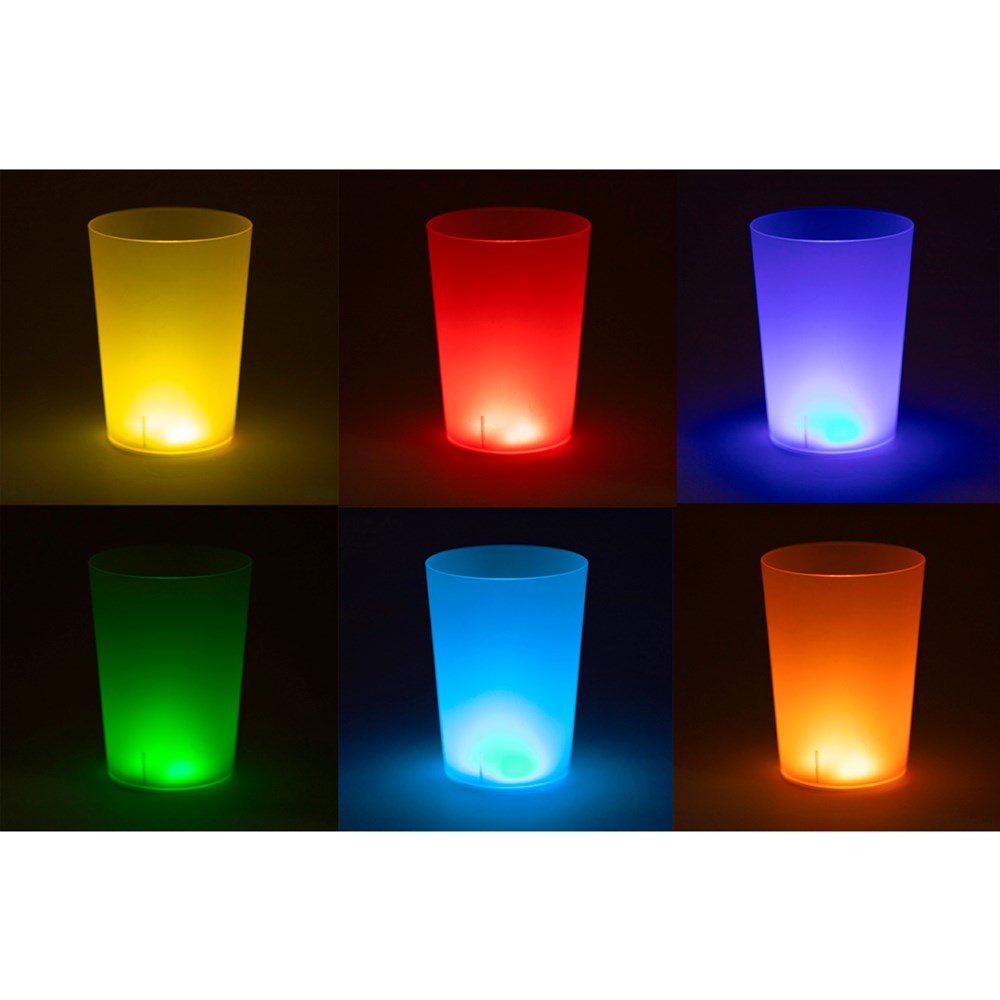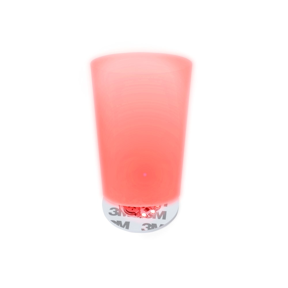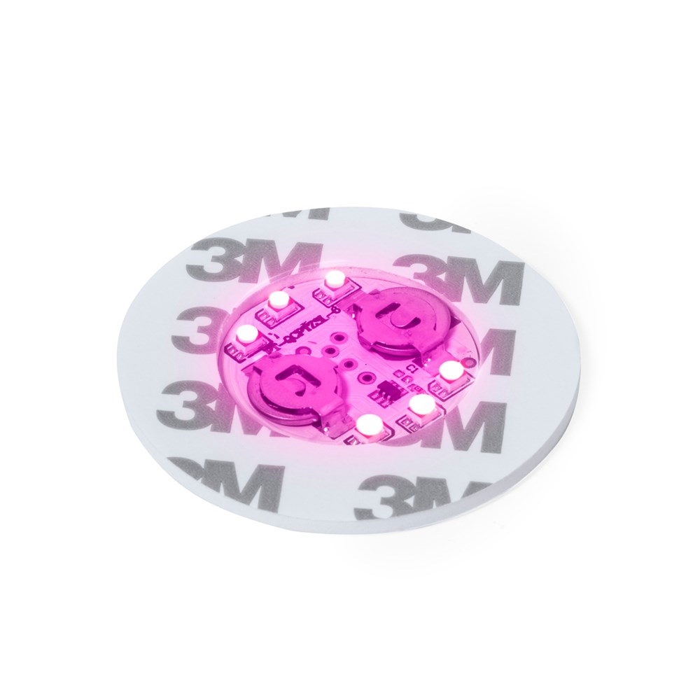 Originele onderzetter met 6 LED's voor de verlichting van drankjes. Met knop op de voet voor verschillende verlichtingsposities: in vaste of gemengde kleuren. Het wordt met een plakband aan de onderkant van elk glas bevestigd en wordt aangedreven door twee knoopcellen (meegeleverd).