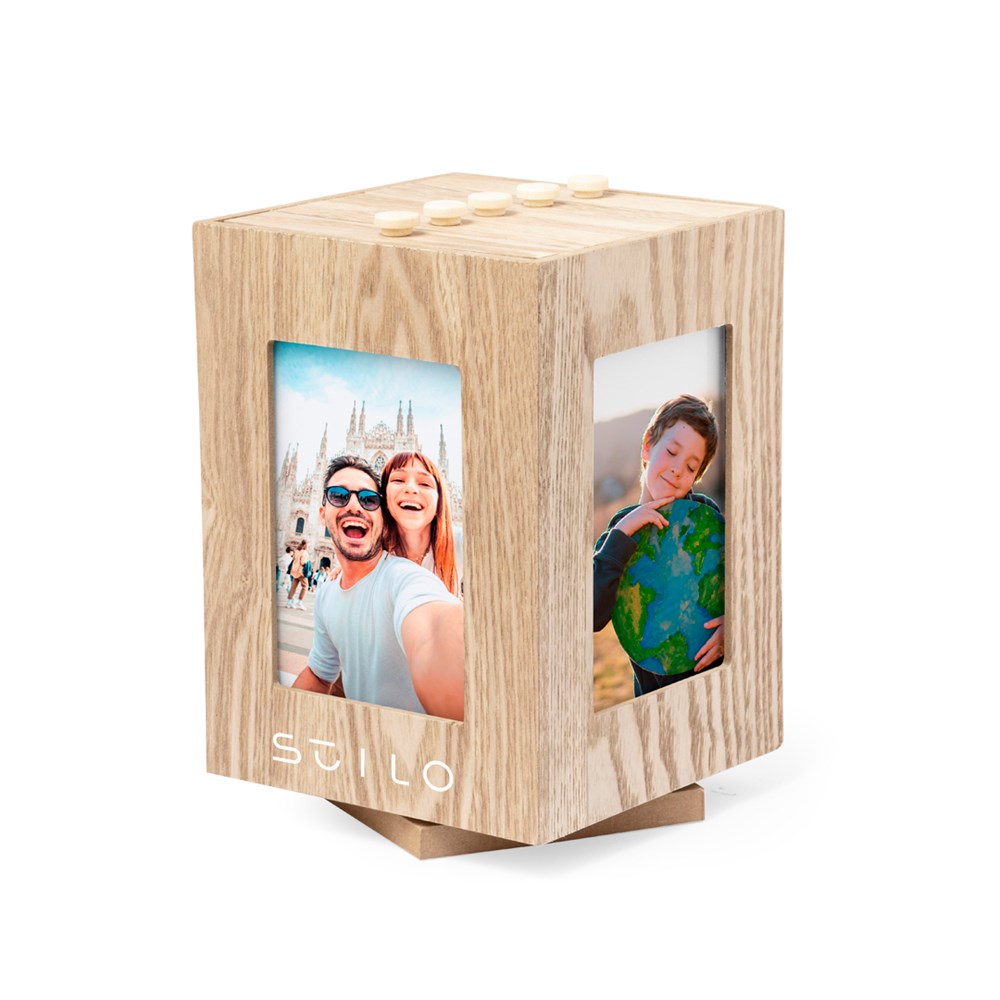 Unieke kubusvormige fotolijst gemaakt van natuurlijk hout. Dankzij het kubusvormige ontwerp kunt u uw 4 mooiste foto's van het album tentoonstellen en bovendien heeft het een 360 graden draaibare basis. Ideaal voor foto's tot 13,5x9 cm. Gepresenteerd in een individuele kraft-designdoos.