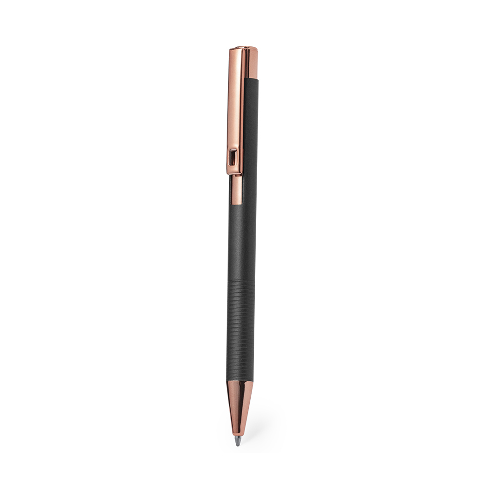 Uitstekende aluminium balpen met drukknopmechanisme. Duurzaam mat afgewerkt aluminium vat met decoratieve elementen in elegante koperen afwerking, met vat in een breed scala aan onderscheidende kleuren. Metalen clip, blauwe inkt en jumbo vulling. Gepresenteerd in een individuele gerecycleerde zak.