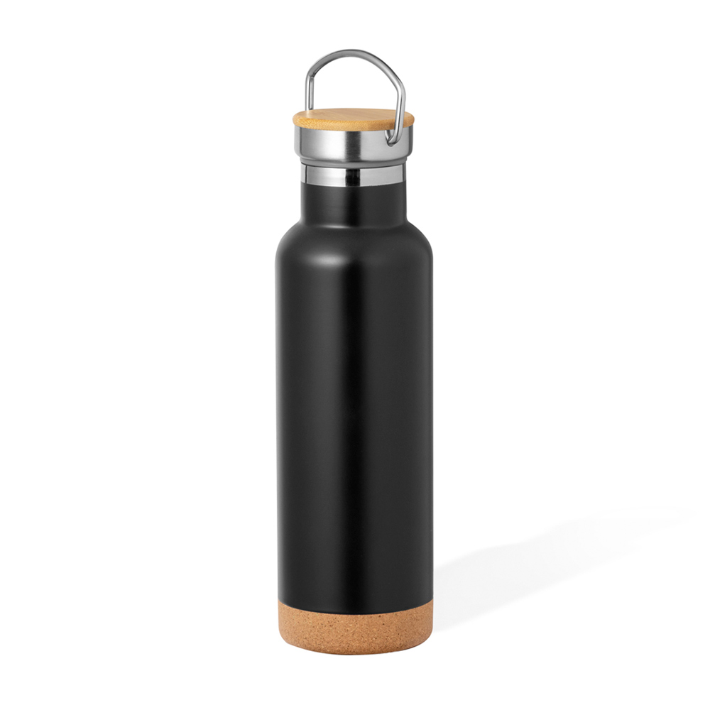 Thermosfles met een inhoud van 650 ml, gemaakt van roestvrij staal met dubbele wand. Inclusief originele roestvrijstalen schroefdop, met bamboedetail, geïntegreerd handvat en een originele kurken basis. Verkrijgbaar in een breed scala aan kleuren en gepresenteerd in een individuele kraft-designdoos.