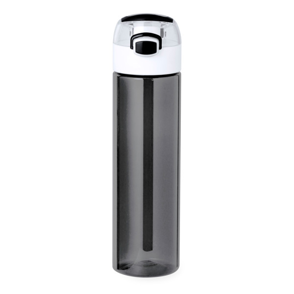 Fles gemaakt van tritan met een inhoud van 650 ml. Ingenieus veerbelast deksel, eenvoudig te openen door op de knop aan de voorkant te drukken, met veiligheidsslot. Optimale afdichting van de schroefdop en het handvat voor gemakkelijk dragen. Verkrijgbaar in een breed scala aan kleuren en gepresenteerd in een individuele kraft-designdoos.