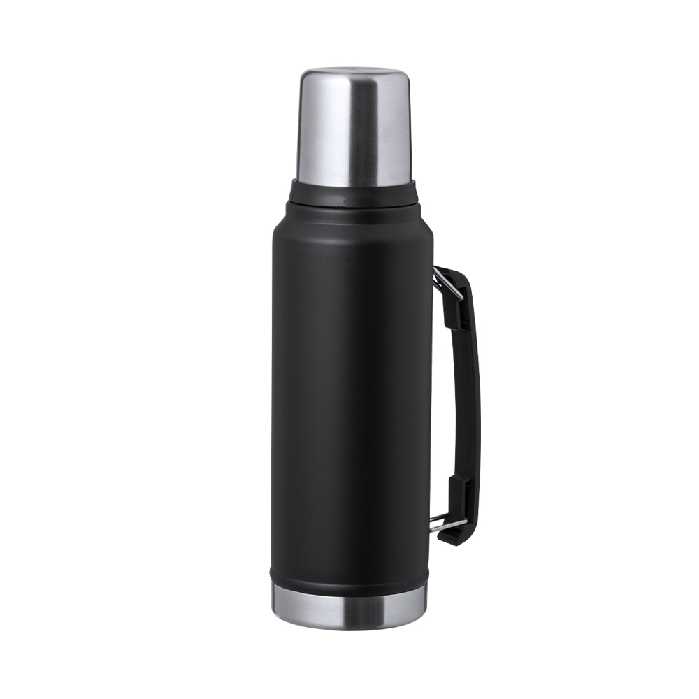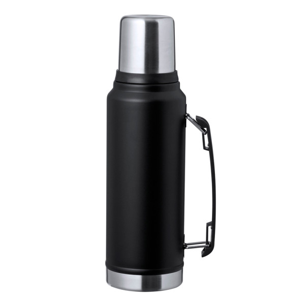 RVS thermoskan met een inhoud van 1L. Combinatie van zwarte kleur en gepolijst staal, elegante afwerking en schroefdeksel met tuimelaarfunctie en inhoud van 200 ml. Handgreep aan de zijkant voor gemakkelijk dragen en gepresenteerd in een kraft-designdoos.