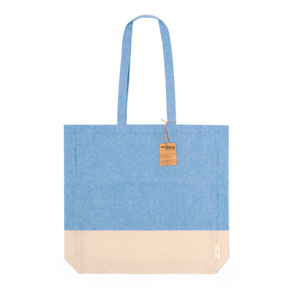 Tas van gerecycled katoen 120 g/m2. Lange hengsels van 70cm met versteviging, gestikte afwerking en kruisje. Label van gerecycled katoen en weerstand tot 8 kg in gewicht. Verkrijgbaar in een breed scala aan eco-kleuren, gecombineerd met een natuurlijke basis.