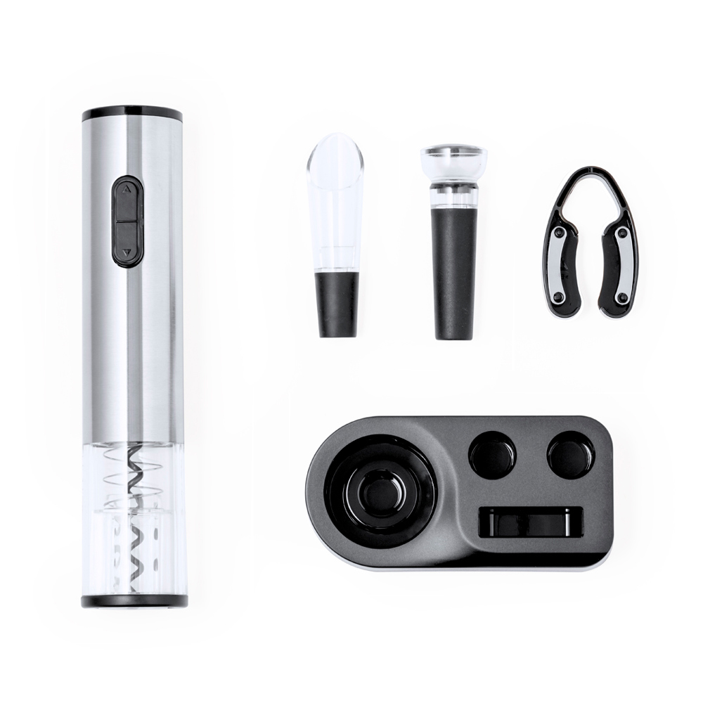 Handige wijnset met 4 accessoires. Bevat een elektrische kurkentrekker, aangedreven door 4 AAA-batterijen (niet meegeleverd), een karaf, een deksel en een capsulesnijder met opdrukmechanisme. Inclusief een elegante zwarte basis om de accessoires netjes op te bergen. Gepresenteerd in een kraft-designdoos.