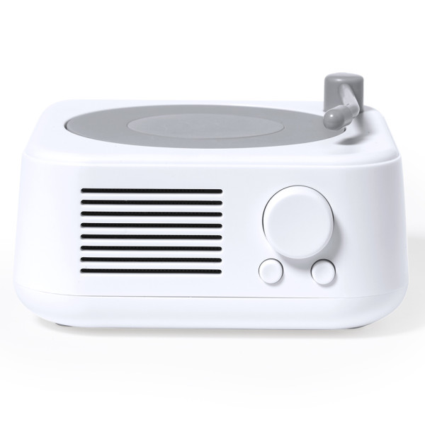 Bluetooth®-luidspreker in originele draaitafelvorm, compact van formaat en met 5W vermogen. 800 mAh lithiumbatterij, inclusief Type C-oplaadkabel en oplaadstatusindicatielampje. Handsfree-functie en FM-radio, met slot voor micro SD-kaarten tot 32 GB capaciteit en een extra ingang voor 3,5 mm jack-connector. Gemaakt van resistent wit ABS met grijze details, en gepresenteerd in een individuele kraft-designdoos, met handleiding in het Engels en Spaans.