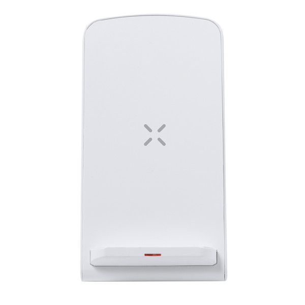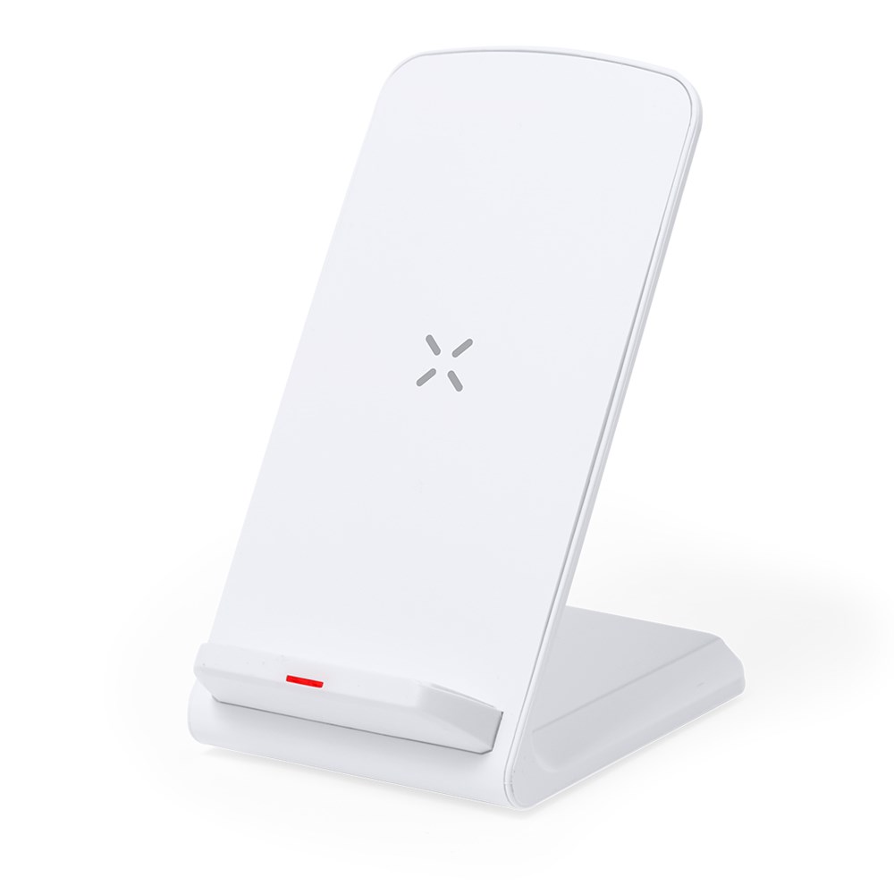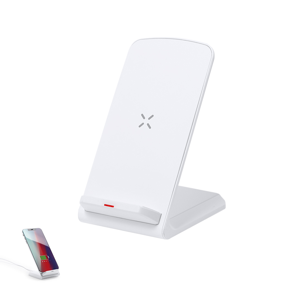 Draadloze oplader 15W met smartphonehouderfunctie, gemaakt van RABS. Laadstatusindicator en compatibel met apparaten uitgerust met draadloze oplaadtechnologie. Groot merkoppervlak en gepresenteerd in een aantrekkelijke kraftdoos. Handleiding beschikbaar in het Engels en Spaans.