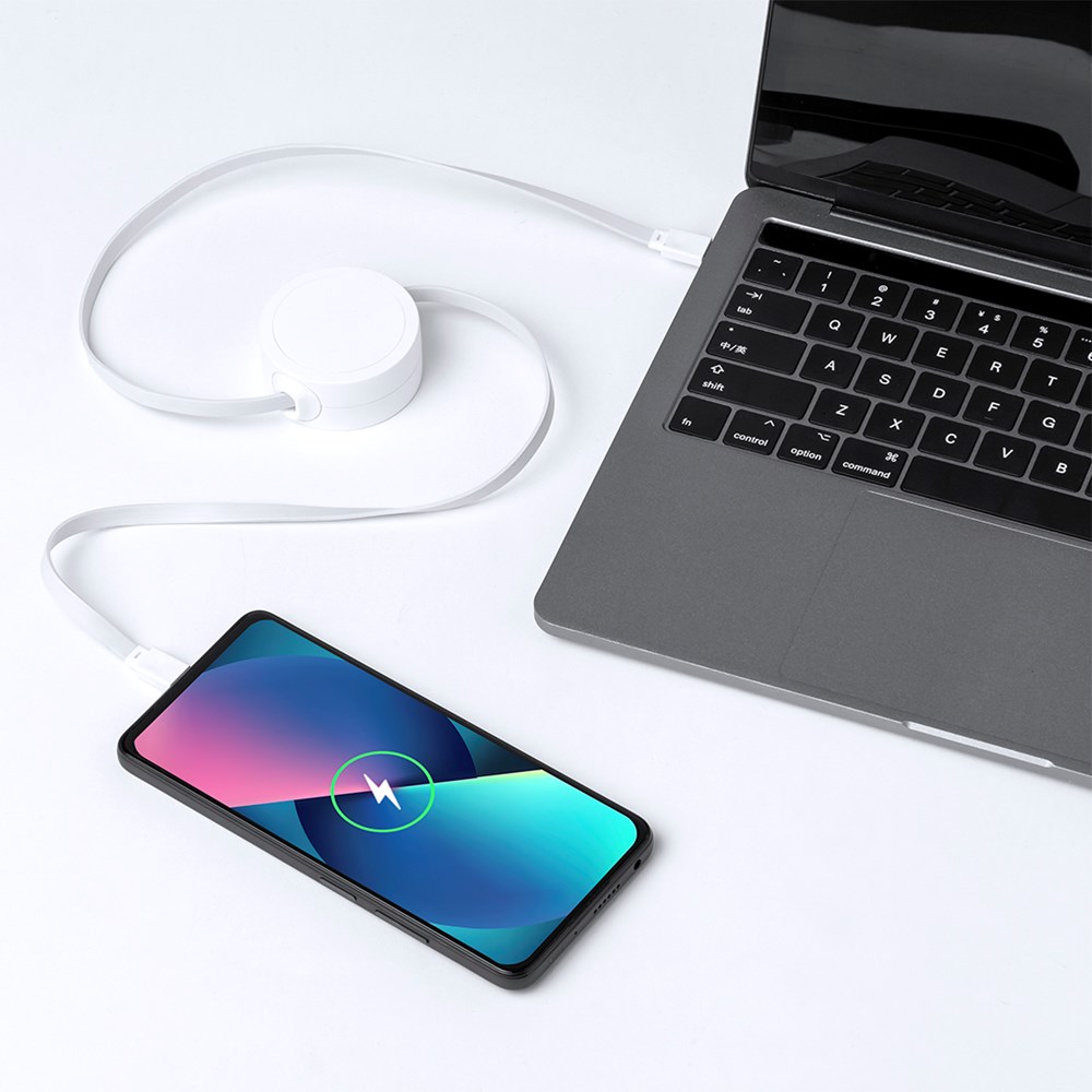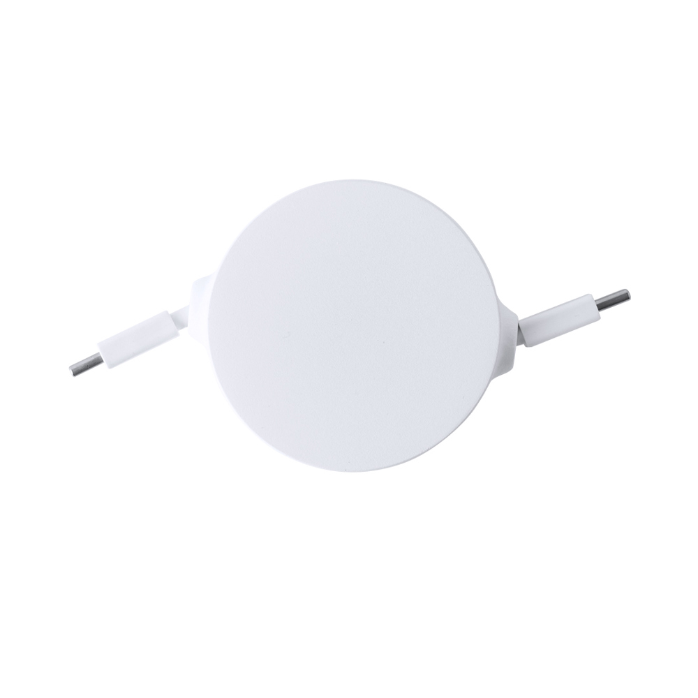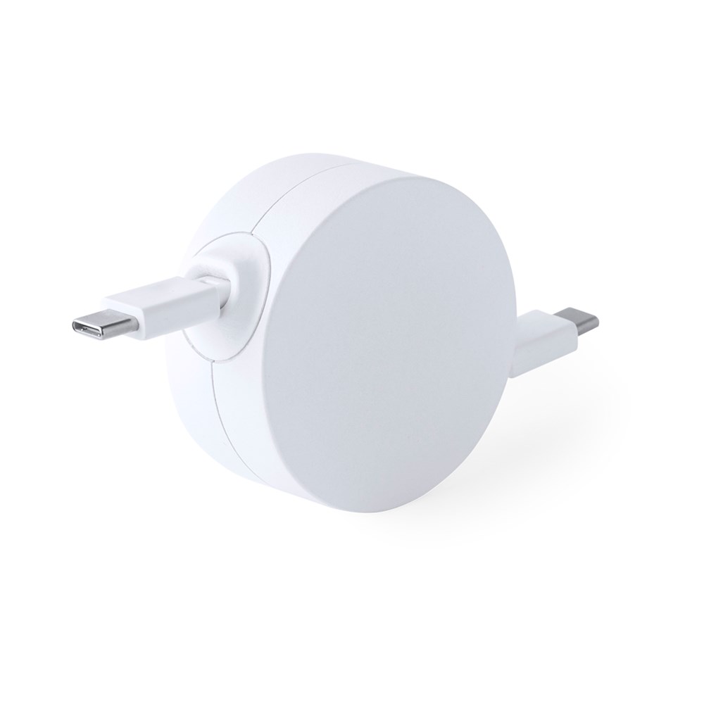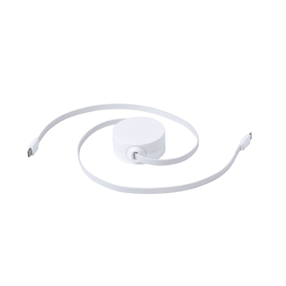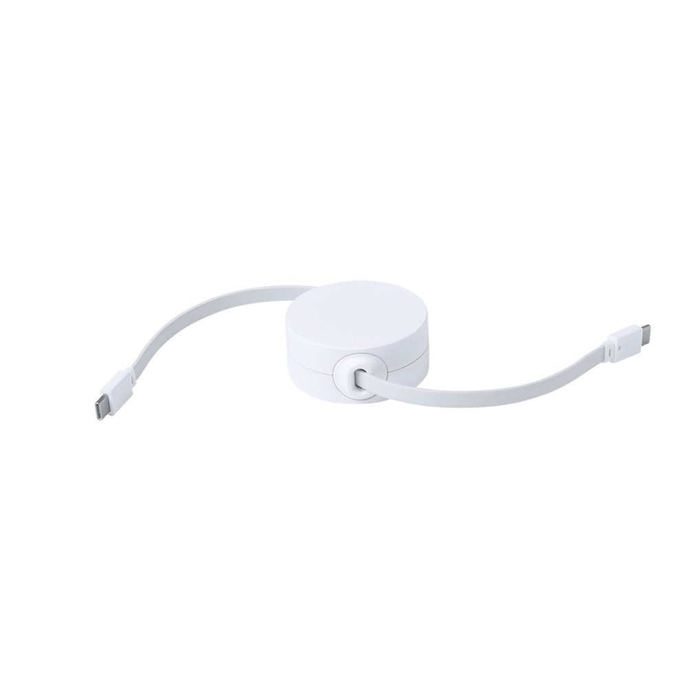 Uitschuifbare oplader- en synchronisatiekabel, geschikt voor het opladen van apparaten en het overbrengen van gegevens. Gemaakt van resistent wit RABS. Centraal deel met groot merkvlak en uitschuifbaar binnenmechanisme. Inclusief Type C in- en uitgangsaansluitingen. Gepresenteerd in een individueel zakje in kraftdesign.