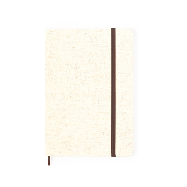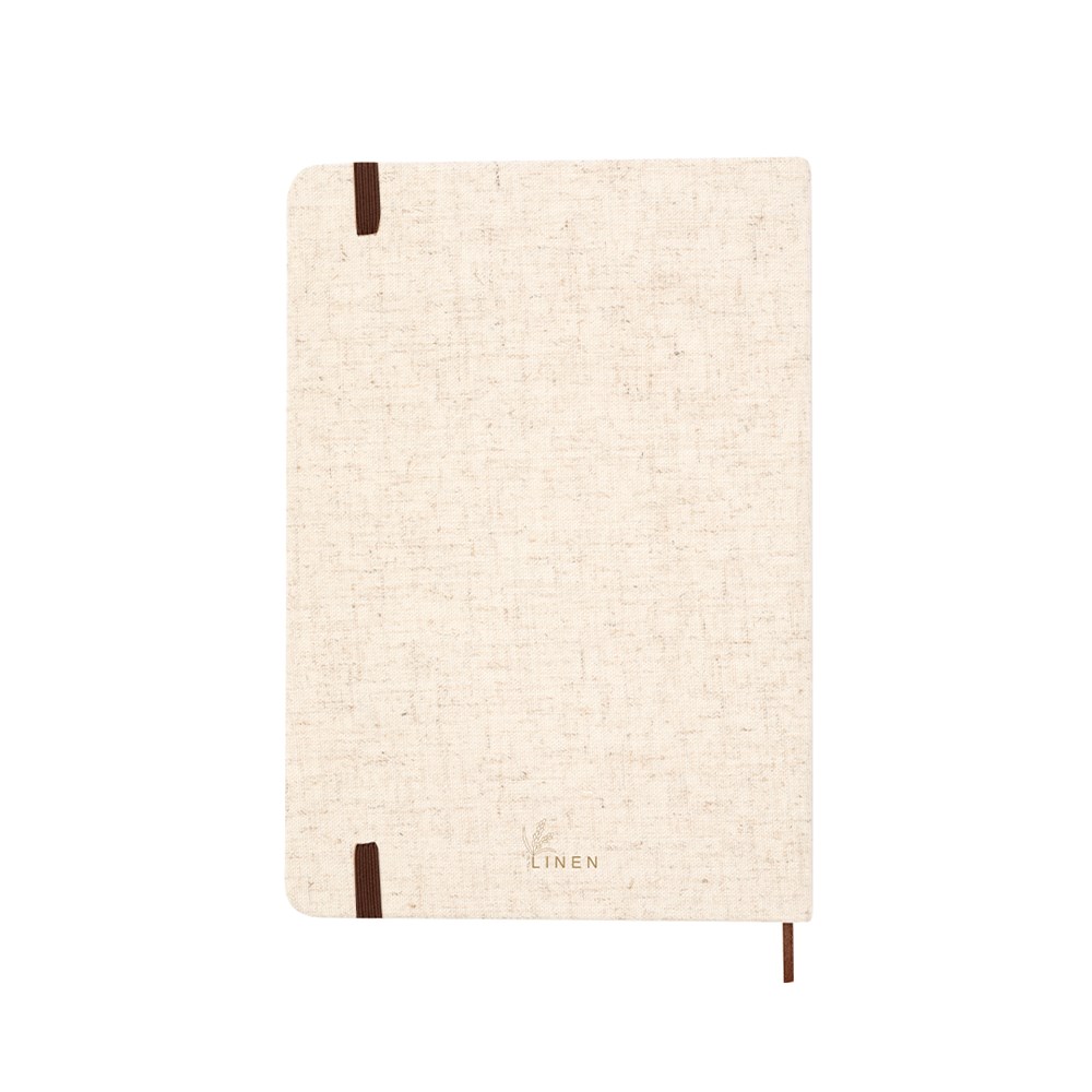 Notitieblok van zacht linnen. Met harde kaft, boekenlegger, bruin elastiek en 80 effen vellen in naturelkleur. Met linnen logo op de achterkant. Gepresenteerd in een individueel zakje.Gemaakt met plantaardige elementen om het gebruik van natuurlijke grondstoffen te bevorderen en vervuilende uitstoot te verminderen.