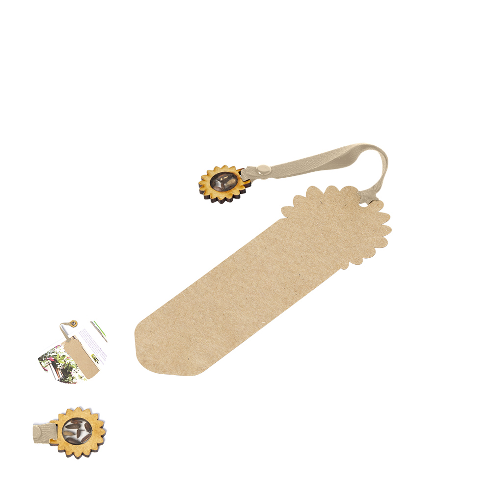 Praktische boekenlegger gemaakt van gerecycled karton, met een pijlvormig ontwerp en een zwart lint waardoor hij gemakkelijk te vinden is. Aan het einde van het snoer staat een originele capsule met zonnebloempitten. Gerecycleerd karton is afkomstig van het hergebruik van productieoverschotten en papierrecyclage aan het einde van zijn levensduur, waardoor het een ecologisch en duurzaam canvas is.