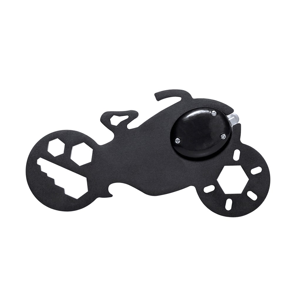 Stoere en handige roestvrijstalen multitool in de vorm van een motorfiets. Met 11 functies, onder andere: inbussleutel in diverse maten en flesopener. Geleverd met 1 LED-zaklamp, aangedreven door een knoopcelbatterij. Gepresenteerd in een gerecyclede papieren zak.
