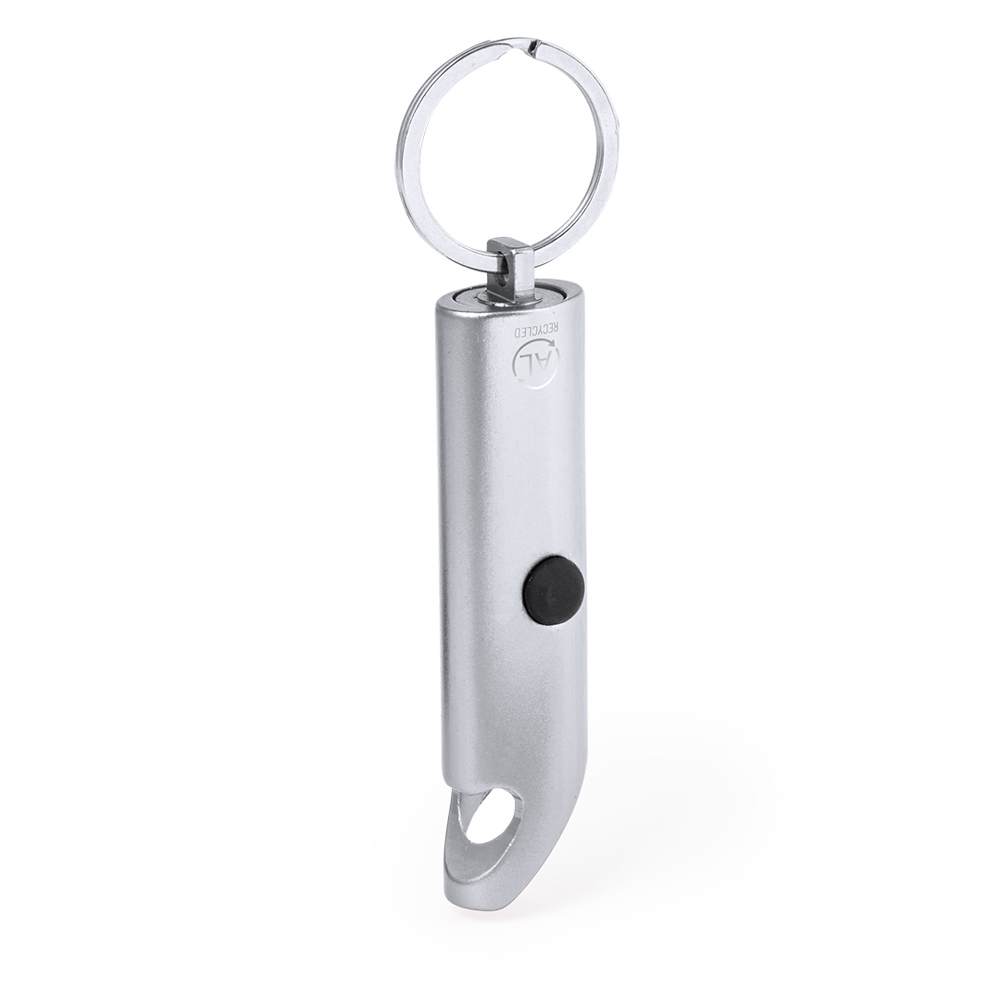 "Duurzame sleutelhangeropener gemaakt van gerecycled aluminium. Dit handige accessoire is voorzien van 3 LED-lampjes en werkt op knoopcelbatterijen (meegeleverd). Met een geïntegreerde opener, die veelzijdigheid biedt in één apparaat. Met logo van gerecycled aluminium op de zijkant en is verkrijgbaar in Verschillende kleuren, gepresenteerd in een kraft-designdoos..Gerecycled aluminium vindt zijn oorsprong in het vrijwel oneindige hergebruik van een van de materialen met het grootste recycleerbaarheidspotentieel, waarbij de kwaliteit van het resulterende product behouden blijft. Deze eigenschap maakt het tot een milieuvriendelijk materiaal van gerecycleerde oorsprong, dat gemakkelijk recyclebaar is. Bovendien kunnen nieuwe materialen en hulpbronnen worden verkregen uit verwerkings- en afvalprocessen, waardoor onder meer minder energie wordt verbruiktGRS-certificering (Global Recycled Standard), die de gerecycleerde oorsprong garandeert van het materiaal dat wordt gebruikt om het product te vervaardigen."